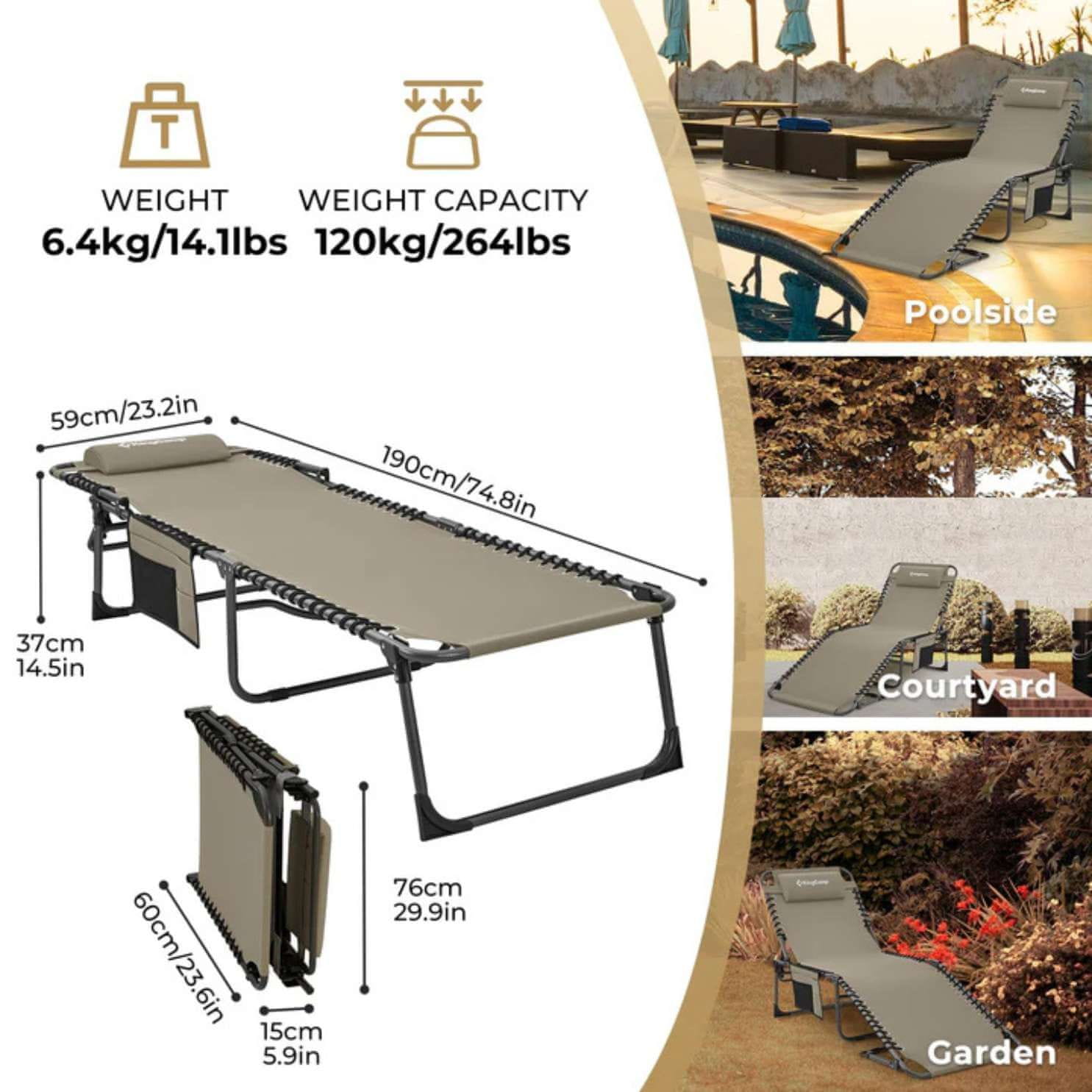 dimenzije rasklopljene ležaljke: 190 × 59 × 37 cm