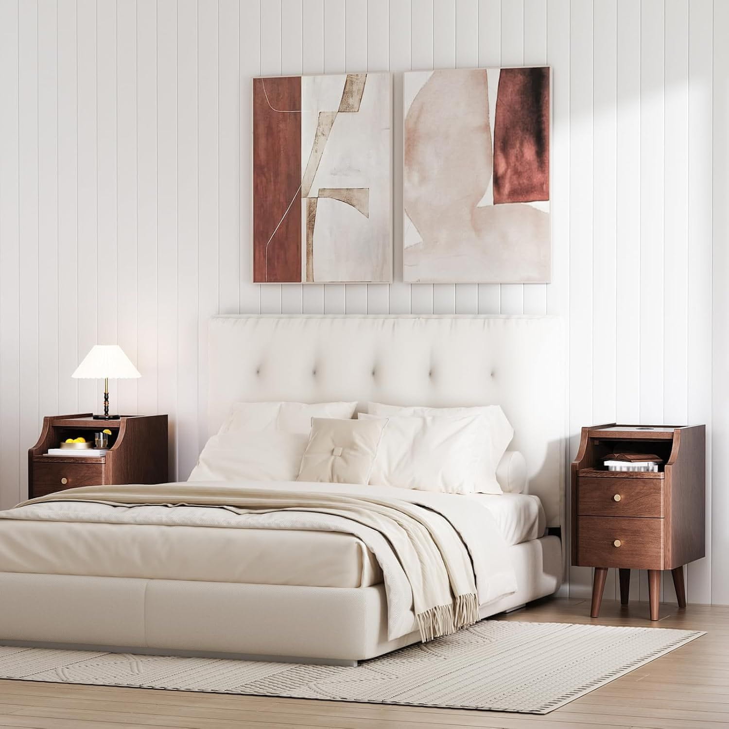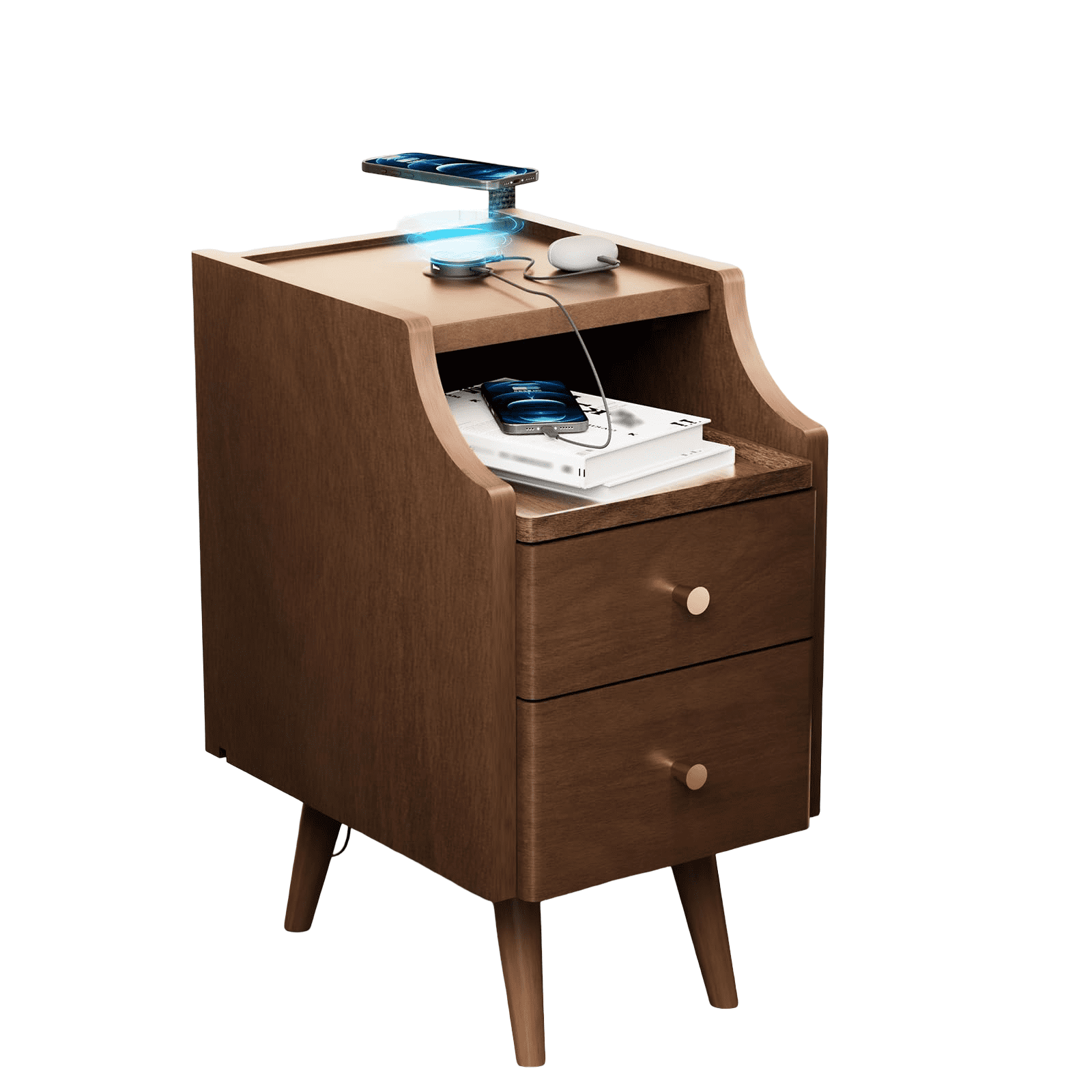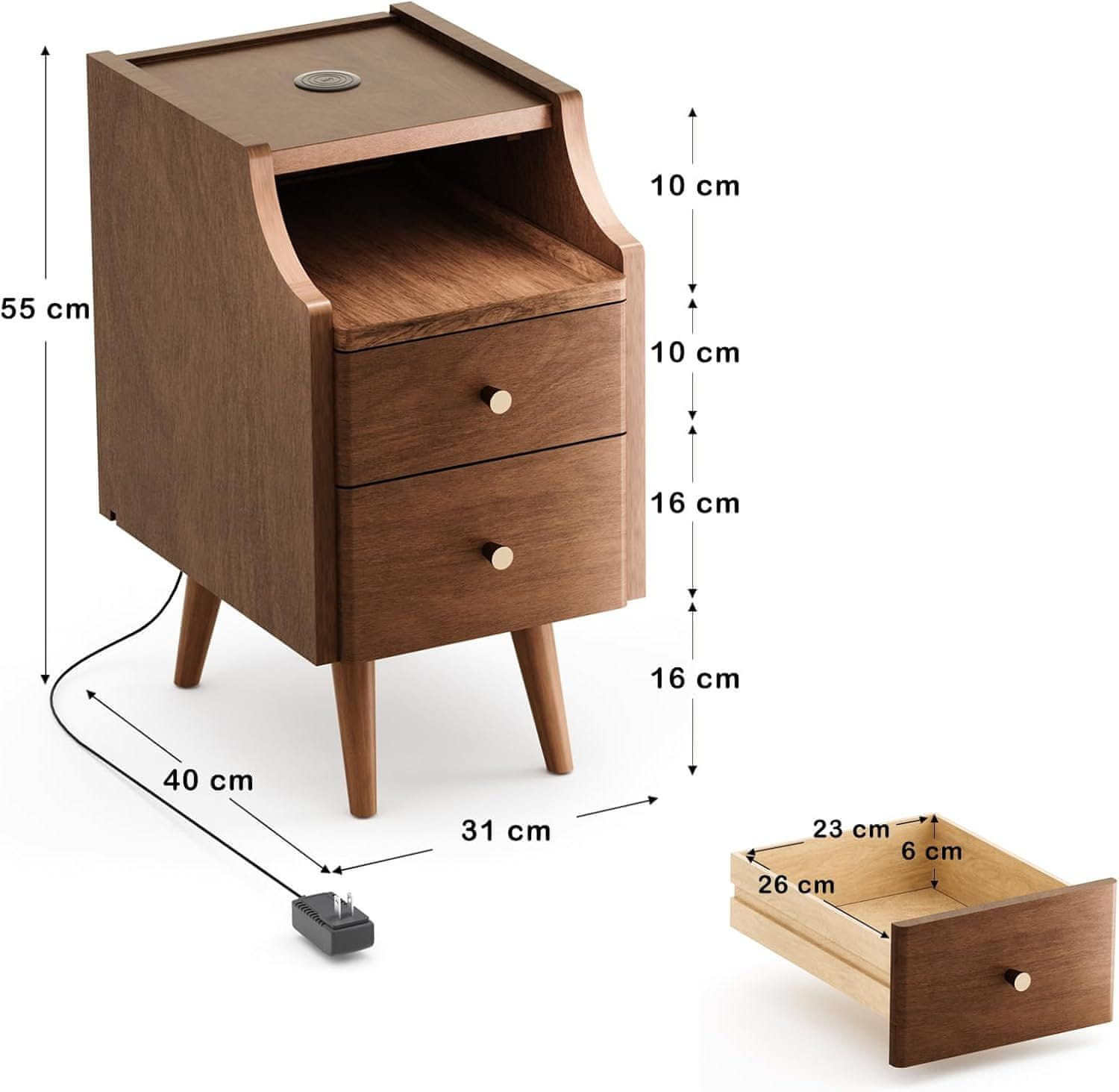 Nikcorp Noćni ormarić od punog drva s 2 ladice i policama, ugrađena stanica za punjenje s USB priključcima, tamni orah
