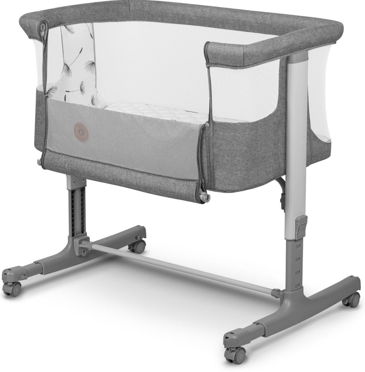 Duljina nogu krevetića Aurora može se glatko podešavati, što omogućuje brzo usklađivanje s visinom roditeljskog kreveta. Uklanjanjem mrežaste stranice i upotrebom priloženih sigurnosnih traka, krevetić se sigurno pretvara u pomoćni ležaj koji potiče blisku vezu između roditelja i djeteta tijekom cijele noći.