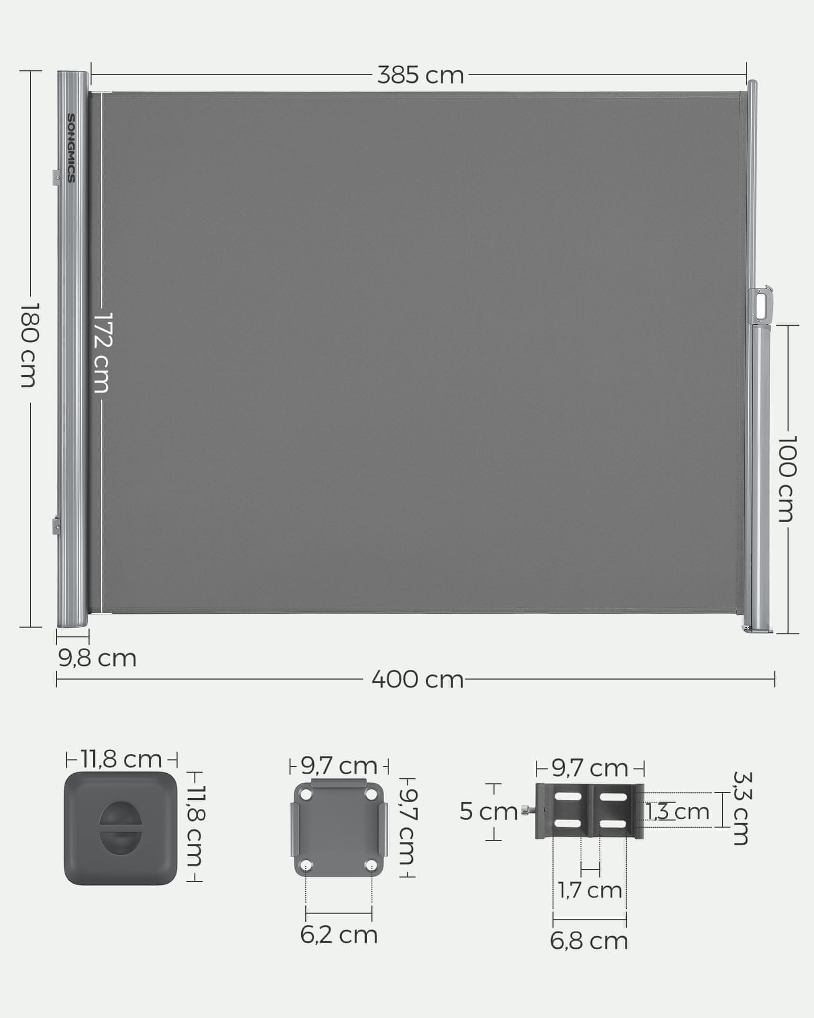Ovaj bočni tende dizajniran je za učinkovitu privatnost i zaštitu od vjetra na balkonima terasama i vrtovima. Njegova robusna konstrukcija i materijali otporni na vremenske uvjete čine ga pogodnim za vanjsku upotrebu povećavajući udobnost i privatnost u vašim vanjskim prostorima za život.