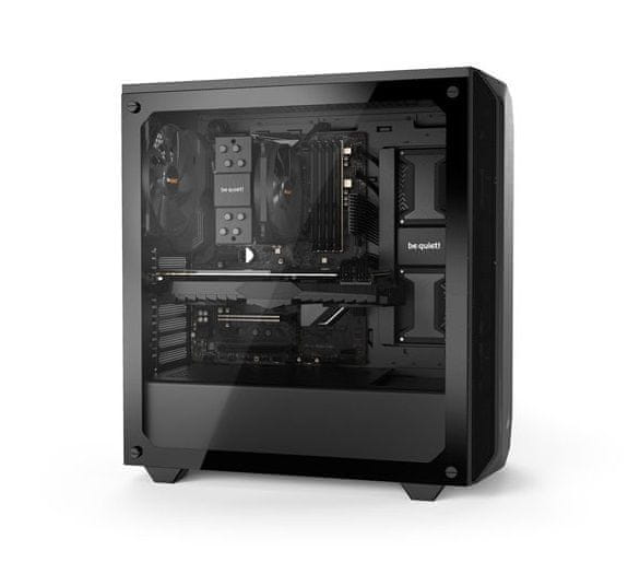Kućište Pure Base 500 s bočnim prozorom nudi puno prostora i prilagodbu za svakoga. Gornja ploča je zamjenjiva i omogućuje izbor između tihog rada sa zvučnom izolacijom ili rada visokih performansi za maksimalni protok zraka, što je posebno prikladno za sustave s vodenim hlađenjem. Već su ugrađena dva ventilatora Pure Wings 2 koji s pažljivo dizajniranim lopaticama omogućuju izvrstan protok zraka.