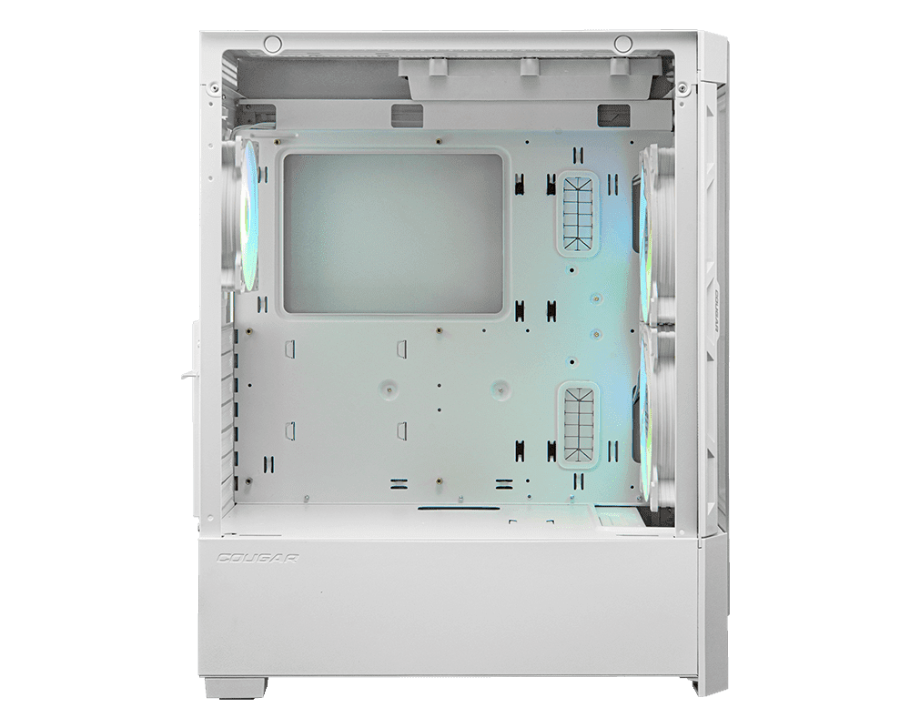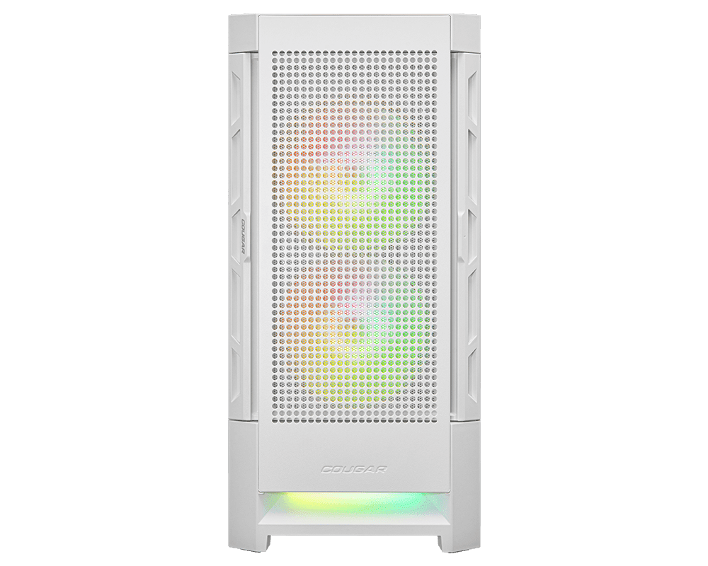 Cougar Duoface kućište predstavlja kombinaciju elegancije i performansi hlađenja. Formiraju ga dvije prednje ploče, jedna posvećena blistavim RGB svjetlosnim efektima; drugi osigurava vrhunski protok zraka i optimizira učinkovitost hlađenja. Ima ugrađena dva masivna aRGB ventilatora od 140 mm, aRGB ventilator od 120 mm i istaknuti logo.