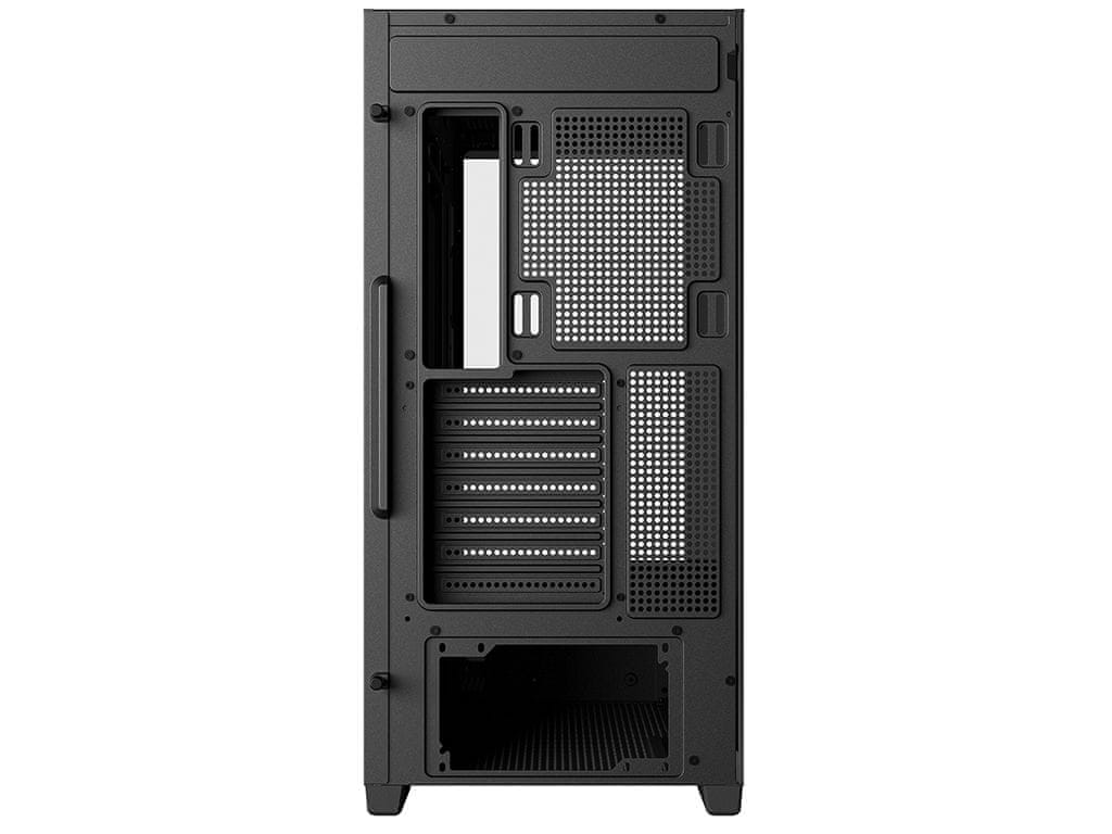 Kućište ima prednju i bočne ploče od kaljenog stakla koje su spojene bez potpornog stupa, što omogućuje potpuno nesmetan pogled na sve unutarnje komponente. Straga se nalazi čak 33 mm prostora za upravljanje kabelima kako bi vaš unutarnji raspored izgledao čisto i organizirano.