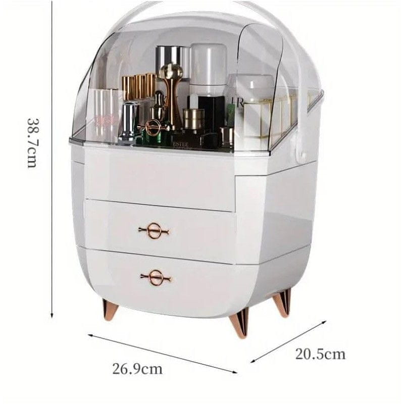 Organizator za kozmetiku – akrilni materijal, prozirni poklopac za brzi pregled, veliki kapacitet, 2 ladice, 2 bočna pretinca, prostrana vitrina za kozmetiku i parfeme, dimenzije 25 × 34 × 18,5 cm