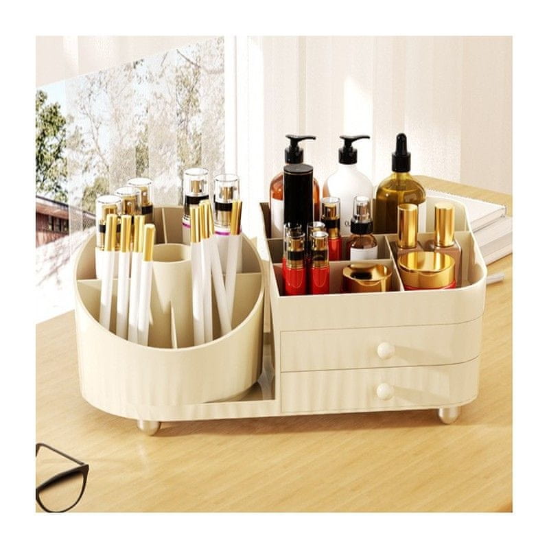 Organizator za kozmetiku – rotirajuća posuda za kistove, 2 ladice za sitne predmete, više pretinaca za sortiranje različitih vrsta kozmetike, dimenzije: 31,3 cm x 14,5 cm x 11,6 cm