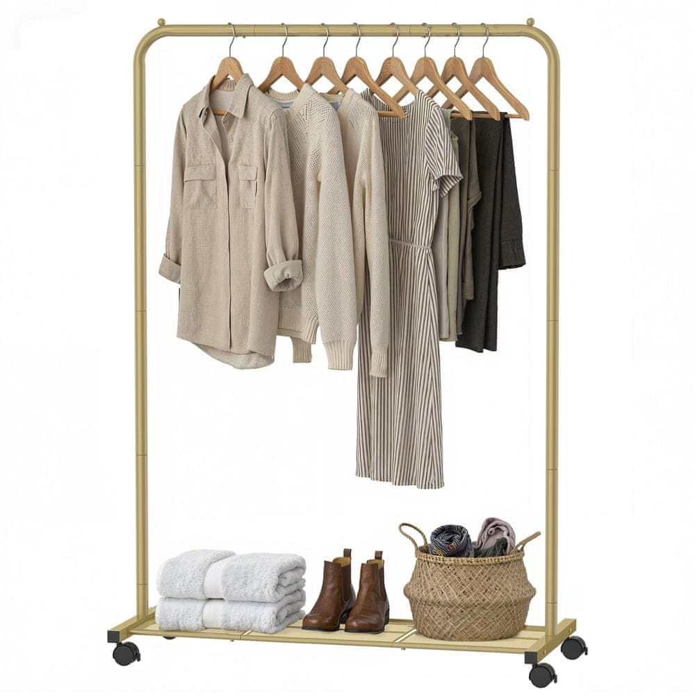 Ovaj čvrsti stalak za odjeću na kotačima nudi praktično spremište za odjeću i dodatke. Njegova robusna metalna konstrukcija i integrirana polica čine ga idealnim za organizaciju odjeće u spavaćim sobama, predsoblju ili garderobama. Jednostavan za pomicanje i praktičan za svakodnevnu upotrebu.