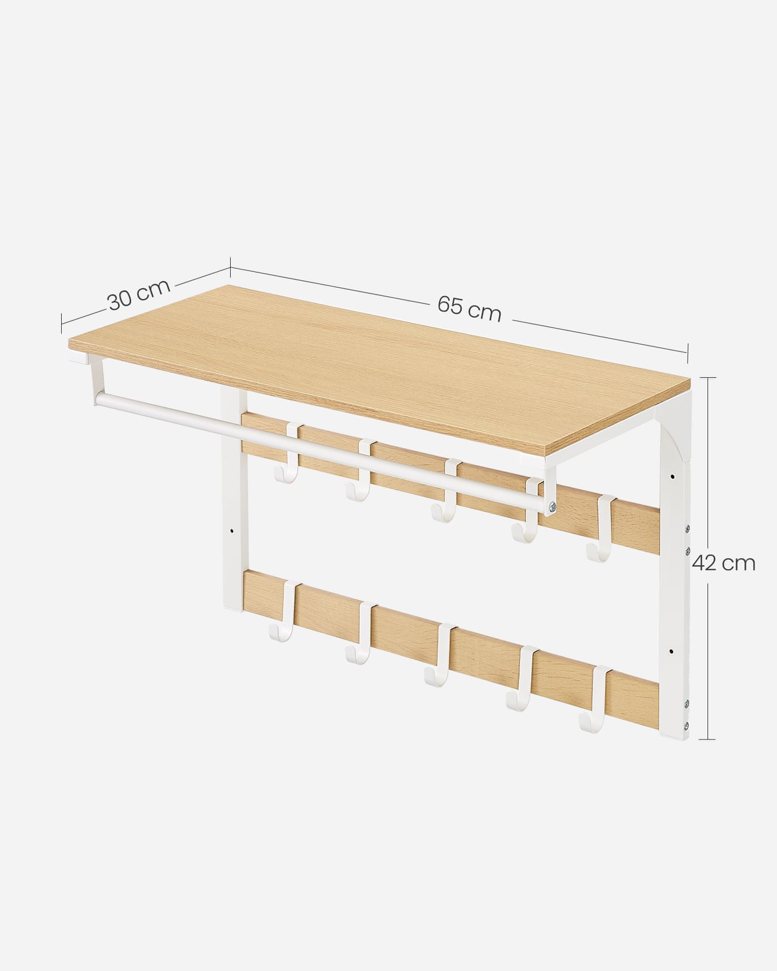 Ova zidna vješalica dizajnirana je za pružanje svestranog prostora za pohranu i organizaciju vašeg hodnika spavaće sobe ili kupaonice. Kombinirajući policu uklonjive kuke i šipku za vješanje nudi praktično rješenje za izlaganje organizaciju i vješanje raznih predmeta na jednom praktičnom mjestu. Njezin moderan stil i funkcionalne značajke čine je elegantnim i učinkovitim dodatkom svakom životnom prostoru.