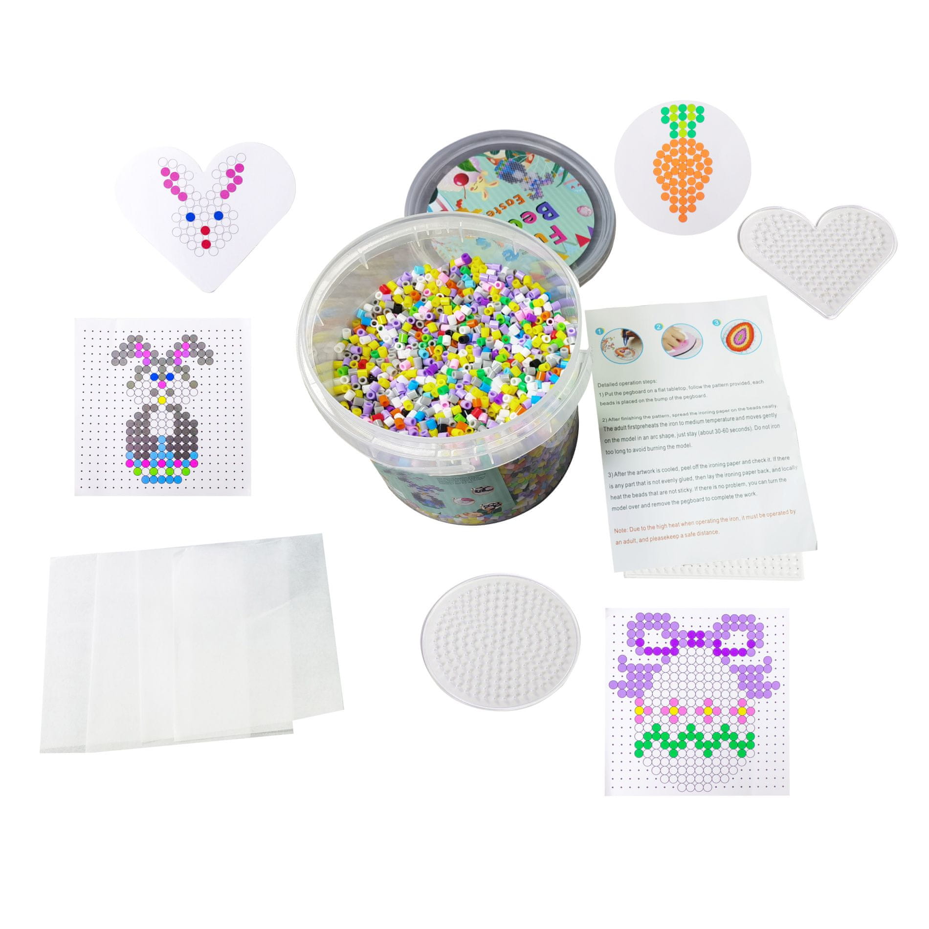 - Set sadrži – kantu s perlicama, pincetu, 5× kartice s uzorcima, 3× podloge i 4× papir za peglanje