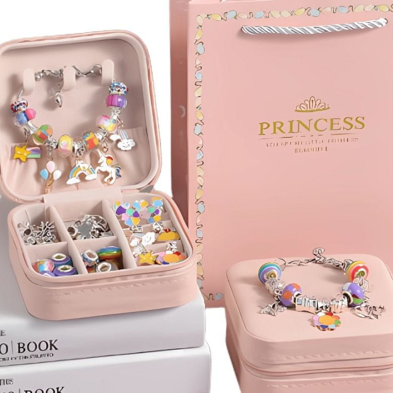 DYI set za izradu nakita – sadrži razne vrste perli i privjesaka, 3 voštane trake u boji, 3 osnovne narukvice dužine 16 cm, elegantnu kutiju za nakit. Set je prikladan za izradu unikatnog i personaliziranog nakita. Pogodno za djecu.