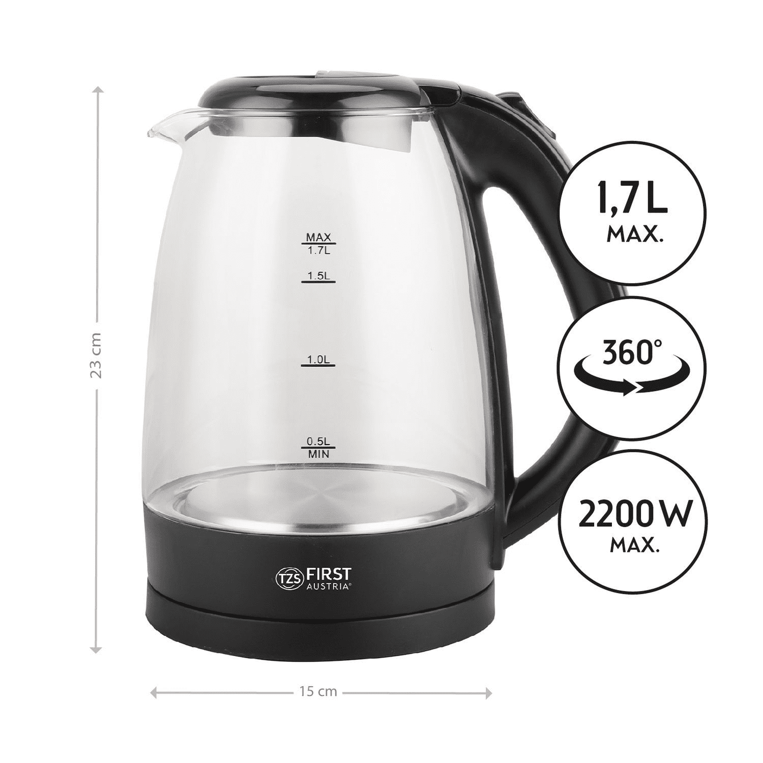 First Austria Prvi grijač vode 1,7L, 2200W, staklo, crno