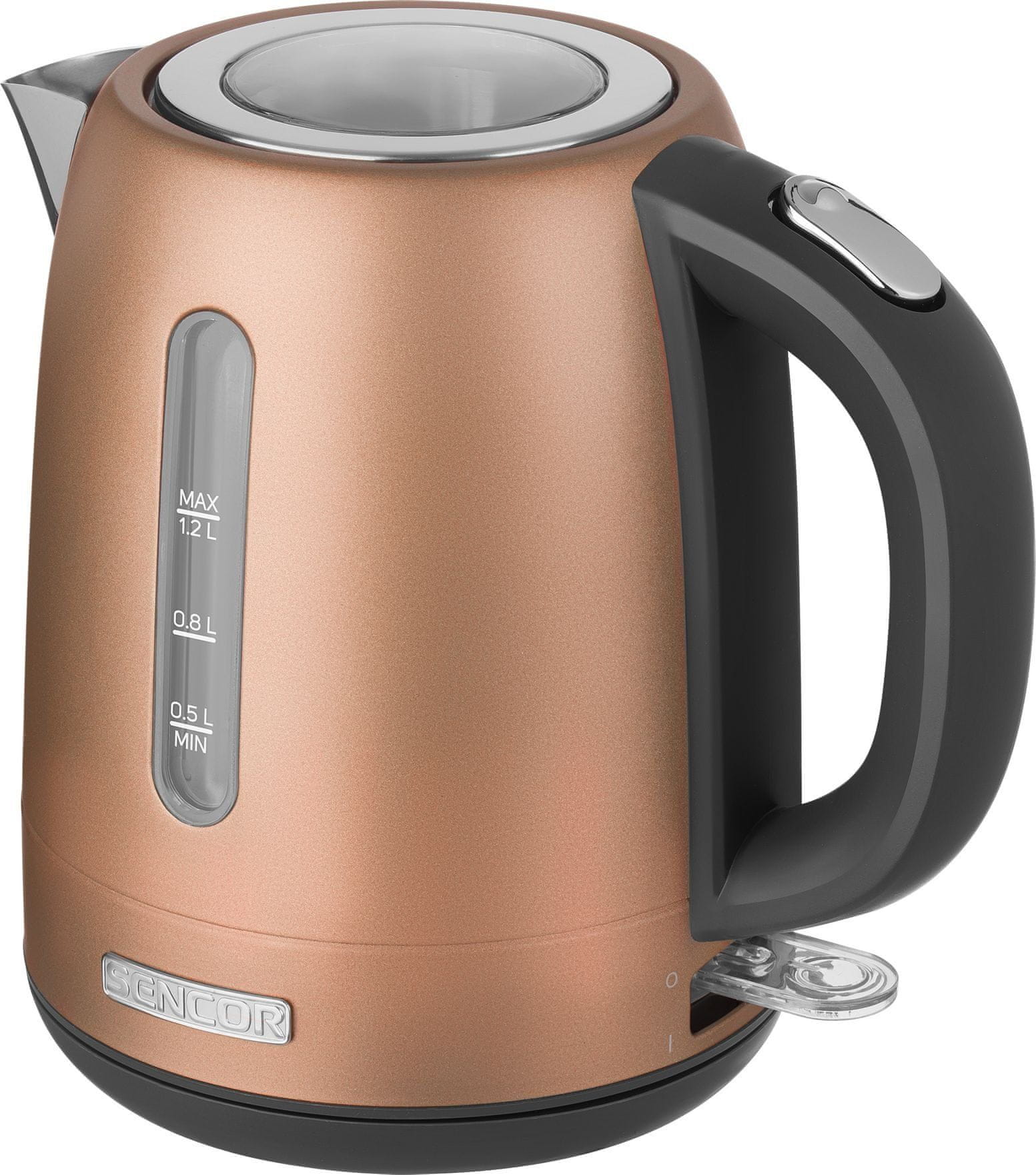 Električni grijač vode Sencor SWK 1226GD u zlatnoj boji kapaciteta 1,2 l. Ima pokazivač razine vode, filtar koji se može ukloniti i prati koji zadržava prljavštinu i talog i izdržljivu bazu za grijanje od nehrđajućeg čelika s prekrivenim grijaćim zavojnicama. Snaga 2150 W.