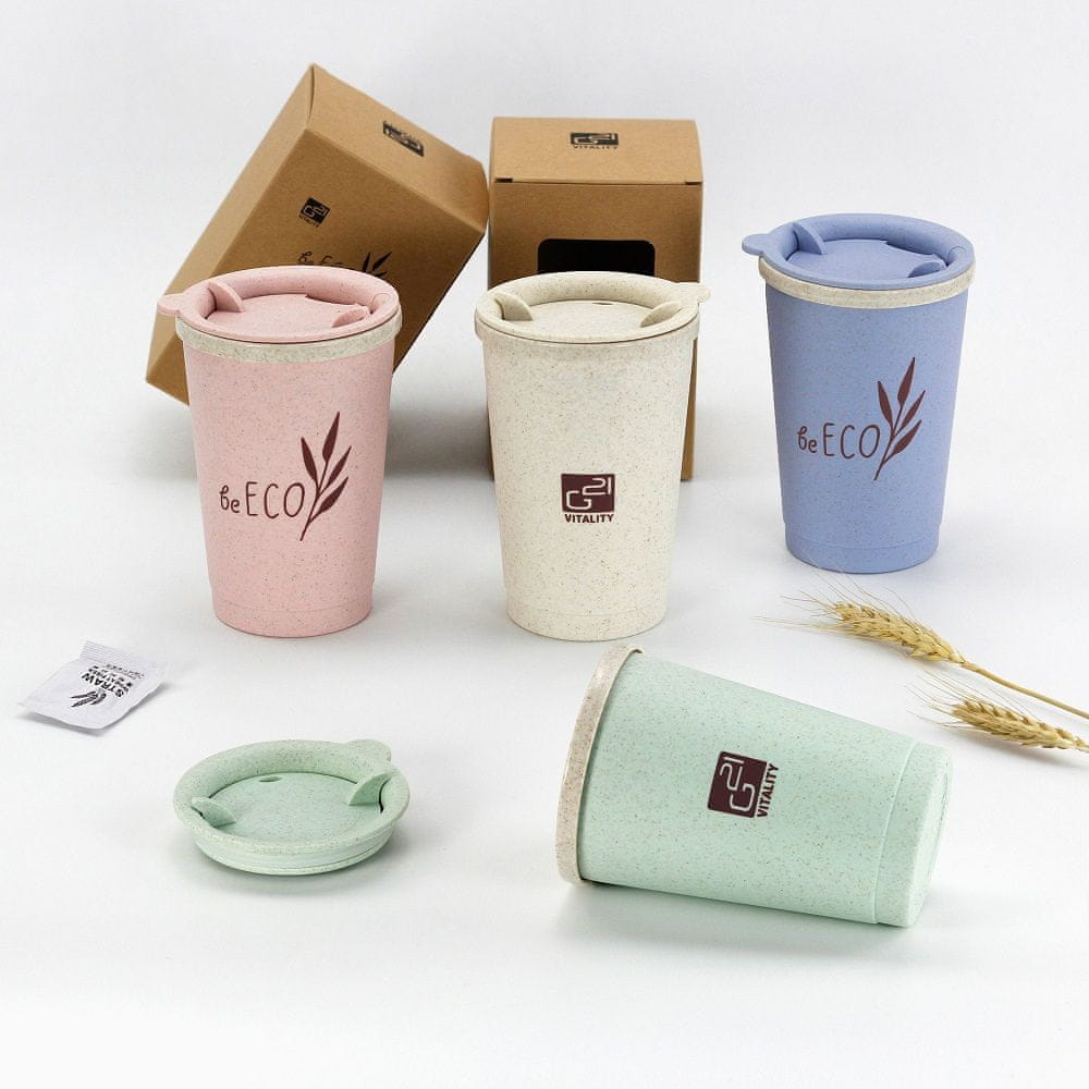 Eko šalica marke G21. Zapremina 0,28 l. Dvostruki zidovi i brtveni poklopac. Sastav izrađen od materijala od pšenične slame, koji ne sadrži gluten, nije alergen i istovremeno je otporan na miris. Otpornost na temperature u rasponu od –20 ° C do 100 ° C. Sastav bez BPA s 50% prirodnog materijala. Dizajnirana za tople i hladne napitke.