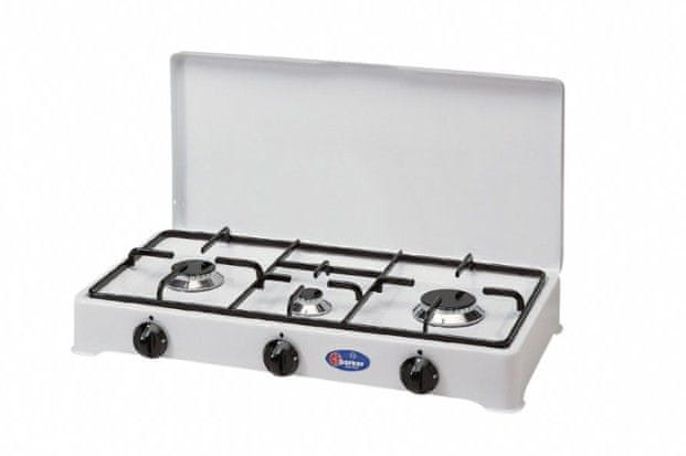 Troslojno plinsko kuhalo s poklopcem opremljeno je sigurnosnim ventilom, gorionici su izrađeni od legure Pyral N2, s emajliranim razdvajačem plamena i emajliranom rešetkom.Plinsko kuhalo s tri gorionika omogućuje istovremeno kuhanje više jela, što štedi vrijeme u kuhinji. Praktično je i lako prenosivo, pa ga možete jednostavno premještati unutar kuhinje ili koristiti na otvorenom.Pogodno je za srednje velike grupe, jer je dovoljno snažno za pripremu obroka za do 6 osoba.Izuzetno je koristan kuhinjski dodatak za boravak u prirodi, kampiranje, planinarenje i ribolov. Također je prikladan za unutarnje prostore, poput manjih stanova ili vikendica. Jednostavan je za čišćenje i upotrebu.