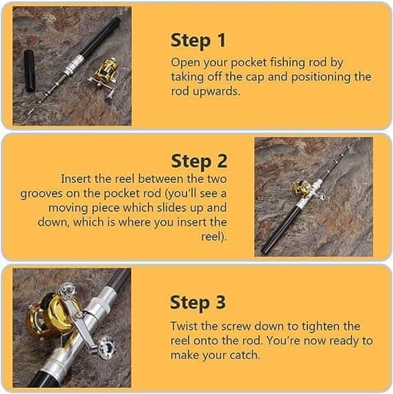 Set za ribolov sastoji se od teleskopske šipke koja se sklapa radi lakšeg transporta i kotača za pecanje sa štitnikom za štap. Džepna veličina omogućuje korisniku uživanje u ribolovu na svakom koraku bez nošenja teške ribolovne opreme.
