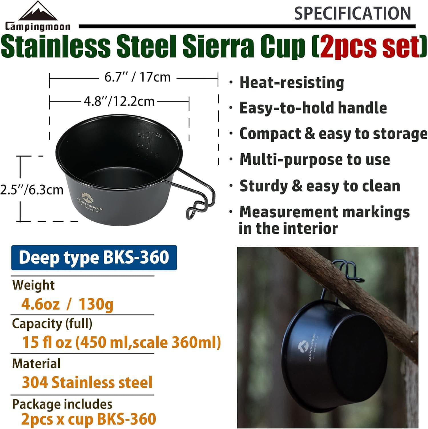 Set od dvije profesionalne turističke šalice tipa Sierra Cup marke CAMPINGMOON predstavlja nezamjenjiv dio opreme za svakog ljubitelja bushcrafta, kampiranja i planinskih ekspedicija. Izrađene od visokokvalitetnog nehrđajućeg čelika 304, ove se šalice odlikuju iznimnom izdržljivošću i otpornošću na koroziju u različitim vanjskim uvjetima. Poseban duboki dizajn i kapacitet od 450 ml čine ove posude iznimno svestranima, pa mogu služiti ne samo kao šalice za piće, već i kao zdjelice za juhu ili posude za kuhanje izravno na vatri ili plinskom plameniku. Elegantna crna završna obrada daje im moderan izgled, a unutarnja mjerna skala omogućuje precizno mjerenje tekućine tijekom pripreme obroka na terenu. Čvrsta čelična konstrukcija osigurava dugotrajnu upotrebu čak i u zahtjevnim ekspedicijskim uvjetima, dok crni premaz olakšava apsorpciju topline tijekom zagrijavanja.