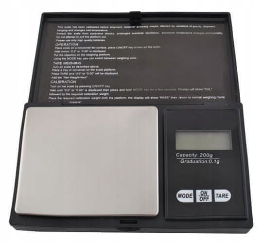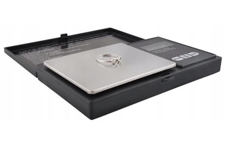 Precizna džepna vaga, vaga s visokom preciznošću do 0,01 g. Dodatna TARE funkcija omogućuje oduzimanje težine paketa prilikom vaganja. Vaga ima jasan LCD zaslon i male dimenzije koje vam omogućuju jednostavno stavljanje u džep. Opremljena je iznimno korisnom funkcijom automatskog isključivanja (60 sekundi) – zahvaljujući kojoj vaga prelazi u stanje mirovanja kada se ne koristi, dok poklopac koji štiti vagu sprječava njeno automatsko uključivanje kada se nosi , npr. u džepu.