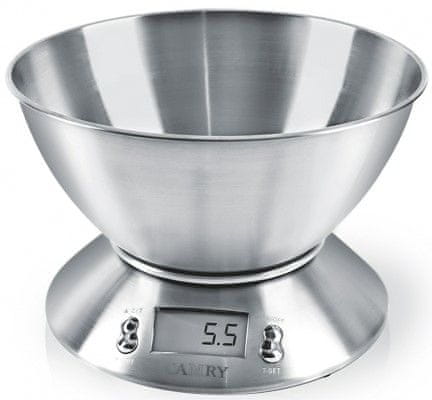 Digitalna kuhinjska vaga s uklonjivom posudom od nehrđajućeg čelika. Vaga ima dva sustava vaganja, mjerač vremena, termometar s rasponom od 0 do 40°C, te indikator preopterećenja i ispražnjenu bateriju.