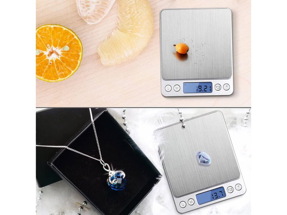 Izrađen od visokokvalitetnih materijalaRaspon mjerenja: 0 – 500gTočnost mjerenja: 0,01 gMjerne jedinice: g / tl / oz / ct / gnTARE funkcijaČelični kontejnerLCD ekran s plavim pozadinskim osvjetljenjemFunkcija brojanjaNapajanje: 2 x LR03 / AAA baterija (isporučena)Dimenzije ekrana: 40 × 15 mmDimenzij