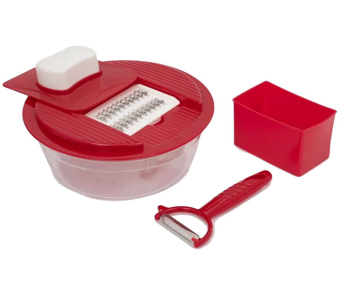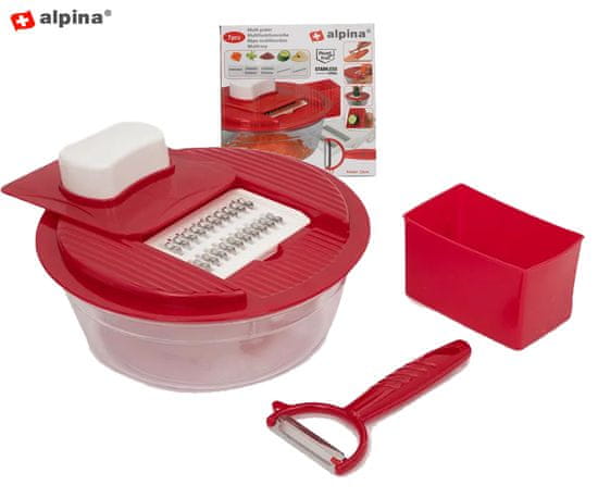 Alpina višenamjenski ribež s kolektorom praktičan je alat za brzu i jednostavnu pripremu raznih namirnica.** Set sadrži nekoliko nastavaka za fino, srednje ili grubo ribanje i rezanje, a uključuje i praktičnu gulilicu. S njegovom pomoći možete bez napora rezati ili ribati povrće, voće, sir ili krumpir.