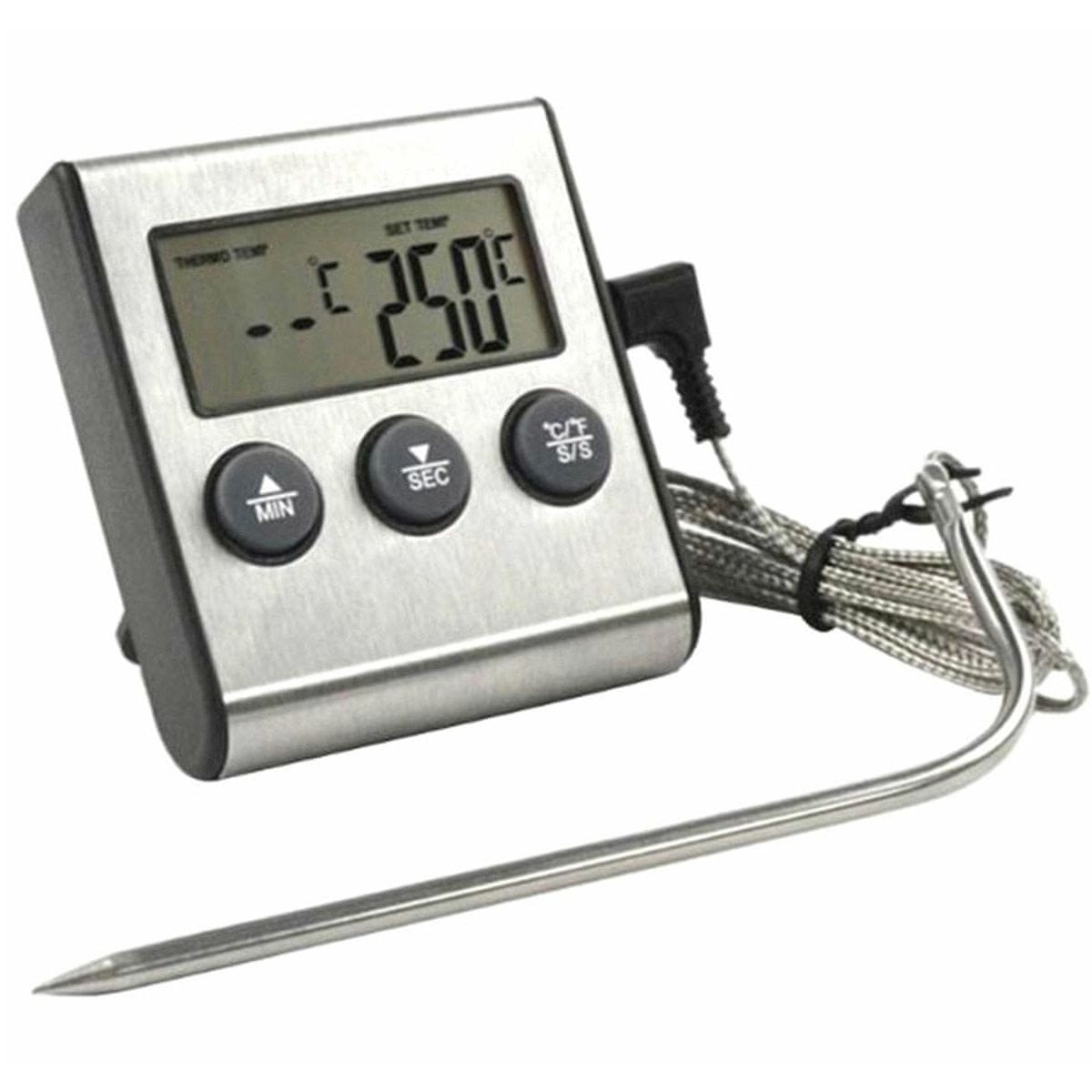 Elektronski termometar sa sondom otpornom na toplinu. Savršeno za mjerenje temperature na roštilju, u smokeru, te za plinske i električne pećnice. Neophodno kada štednjak nema ugrađen indikator temperature. Uređaj ima jasan LCD zaslon koji olakšava očitavanje mjerenja. Dugi kabel i sonda u obliku vrha otpornog na toplinu omogućuju jednostavno postavljanje čak iu hranu i mjerenje temperature mesa. Termometar ima i mjerač vremena namješten na 99 minuta te zvučni signal koji signalizira protok vremena i postizanje deklarirane temperature. S ovim izvrsnim dodatkom moći ćete puno lakše kontrolirati temperaturu pečene hrane.