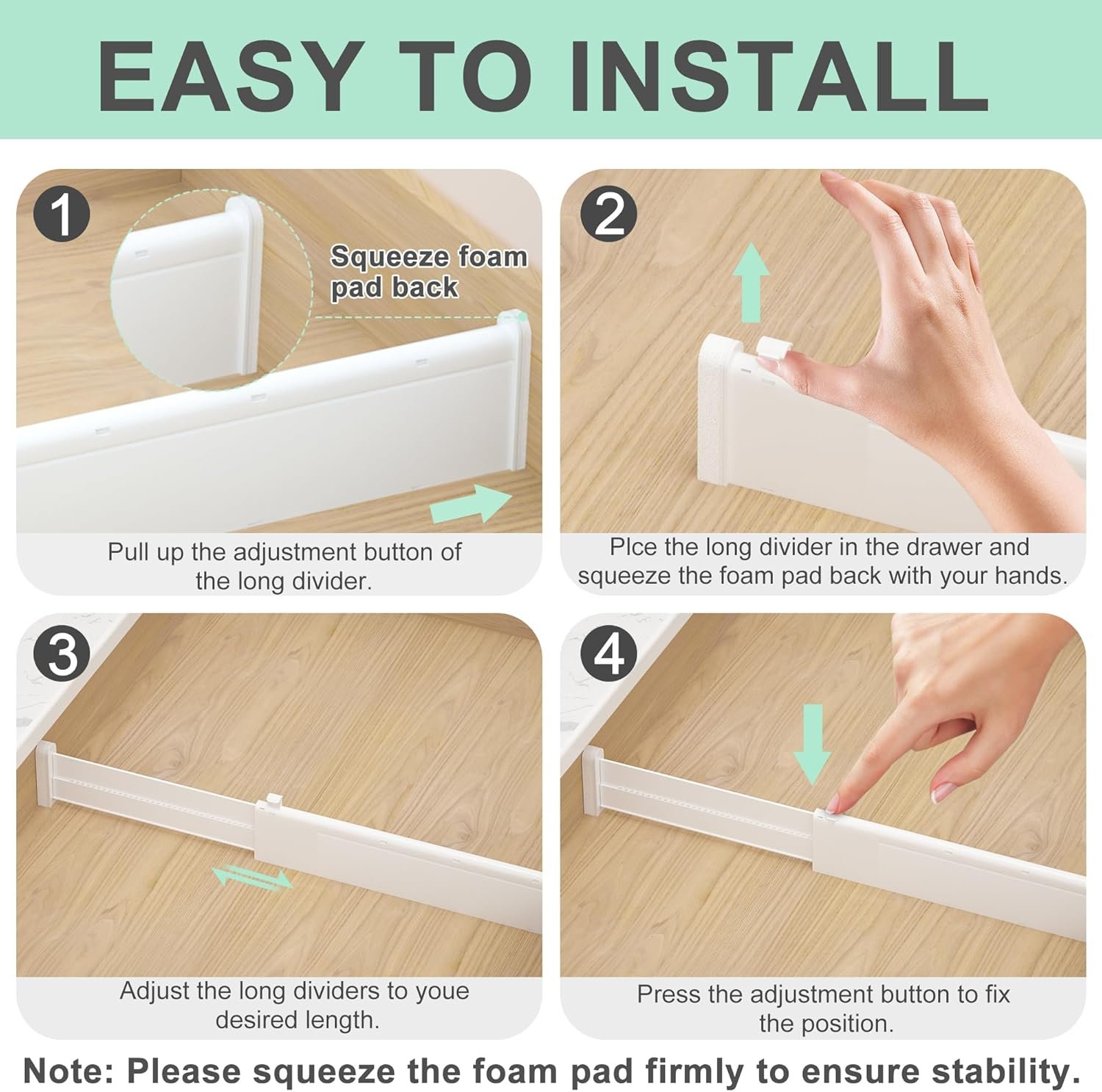 Podesive pregrade za ladice (Set 8 kom.) – Riješite se nereda! Proširivi organizatori (32–58 cm) idealni su za kuhinju, ured ili ormar. Stabilne, jednostavne za montažu bez alata, visine 6–10 cm. Organizirajte odjeću, pribor za jelo ili uredski materijal brzo i efikasno. Izdržljiv materijal za dugot Cijeli opis