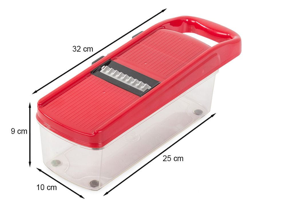 Set uključuje šest izmjenjivih oštrica, ručku za držanje i gulilicu. Posuda ima neklizajuće nožice koje osiguravaju stabilan položaj prilikom ribanja povrća.