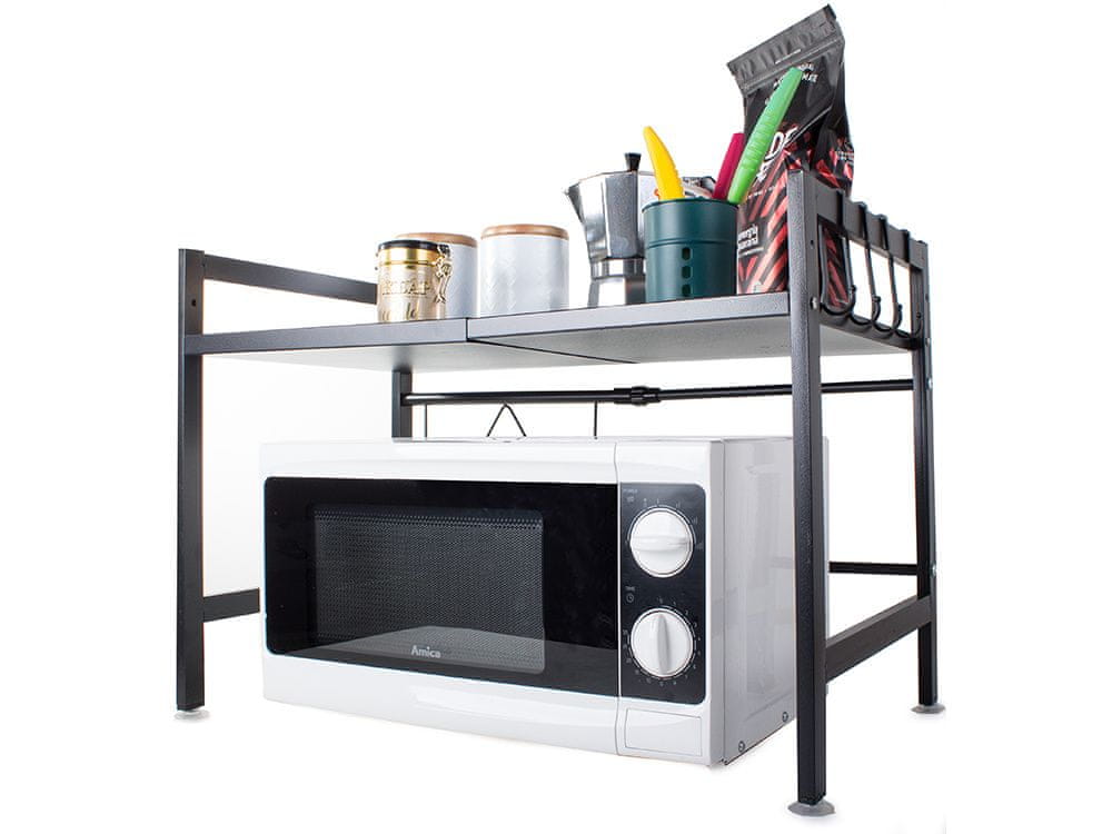 Podesiva kuhinjska polica za mikrovalnu pećnicu uštedjet će mnogo prostora u kuhinji. Zahvaljujući tome, možete stvoriti dodatni prostor za pohranu začina i druge kuhinjske opreme, kao što su bojler, aparat za kavu, toster, druge mikrovalne pećnice itd.