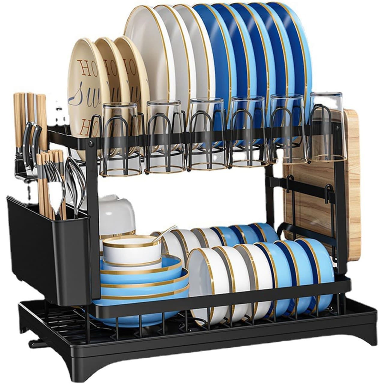Netscroll Dvonivojski odcejevalnik za posuđe, od nehrđajućeg čelika, sušilo za posuđe s 360° odvodom, za tanjure, čaše i pribor, crni, Dishy