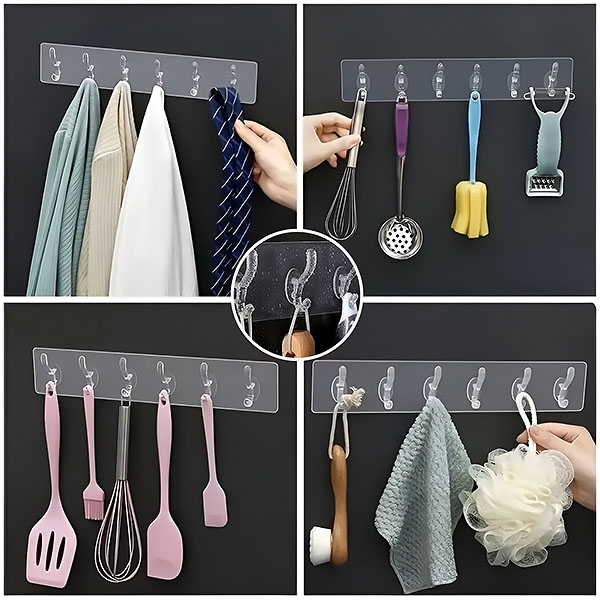 Preobrazite svoju kućnu organizaciju s ovom fleksibilnom samoljepljivom vješalicom. Sa šest čvrstih kuka, savršena je za držanje kuhinjskih alata, dodataka za kupaonicu, odjeće i još mnogo toga.