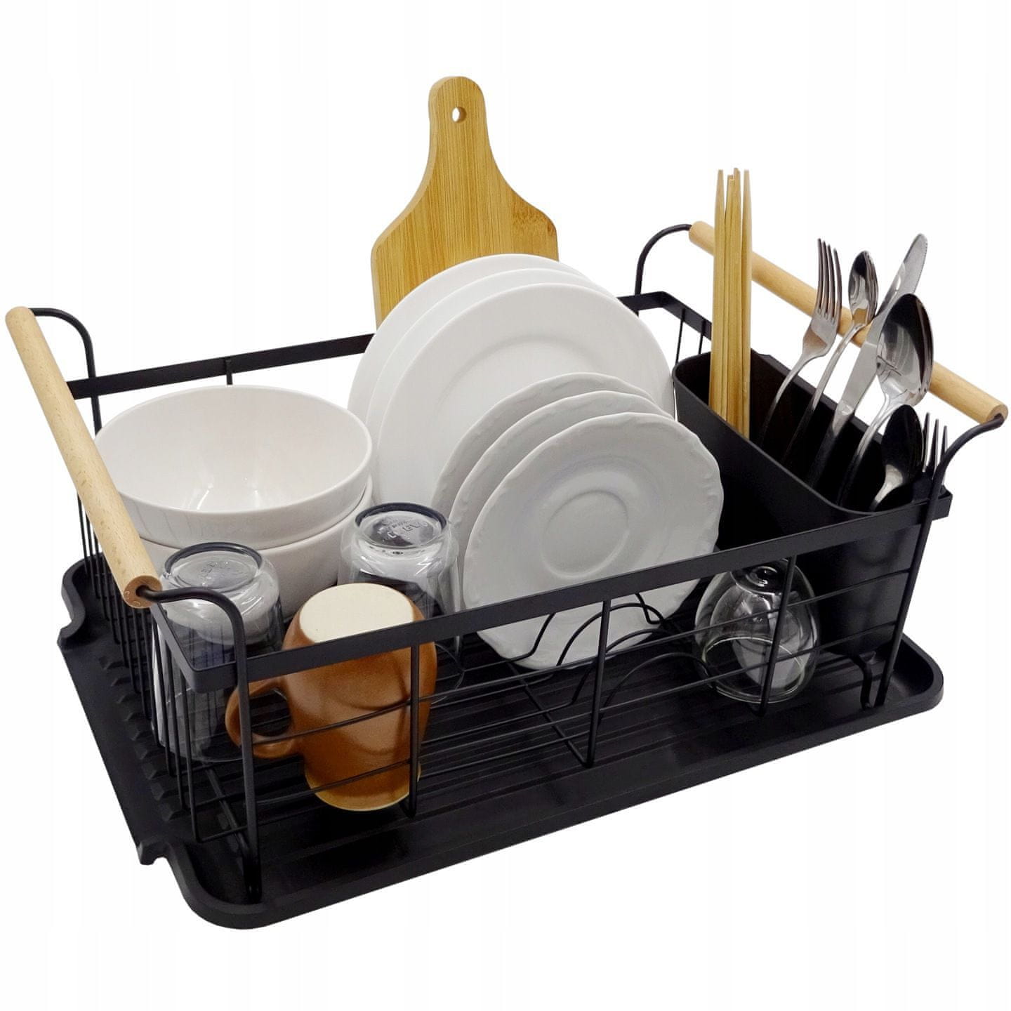 ELEGANTAN IZGLED – Crni metalni okvir savršeno će se uklopiti u svaki kuhinjski interijer. Cijela stvar izgleda sjajno i savršeno ispunjava svoju funkciju.KVALITETA – Pladanj i ocjeđivač pribora za jelo izrađeni su od visokokvalitetne plastike.IZDRŽLJIVOST – izdržljiva metalna konstrukcija.