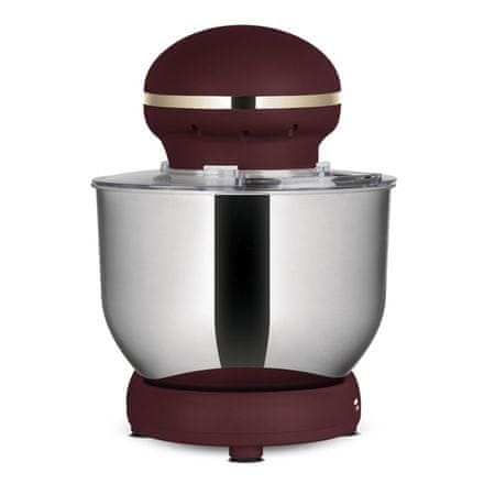 Ovaj kuhinjski robot u modernoj mat bordo boji idealan je pomagač za sve koji vole peći i kuhati s lakoćom. Zahvaljujući snažnom motoru, velikoj posudi od nehrđajućeg čelika i nekoliko nastavaka, može bez napora mijesiti tijesto, miješati pjenjačom i miješati. Moderan i tih dizajn savršeno se uklapa u svaku kuhinju.