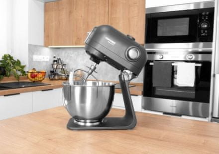 Robot je opremljen prostranom zdjelom od nehrđajućeg čelika od 5 litara s praktičnom ručkom i poklopcem te tri metalne metlice koje lako rješavaju pripremu krema, šlaga, bjelanjaka, majoneze, umaka i tijesta s kvascem. Flexi metlica s gumenom špatulom idealna je za lagane kreme, nadjeve i preljeve – savršeno prati stijenke zdjele i učinkovito struže smjesu bez ostavljanja ostataka. Kuka za tijesto bez napora obrađuje čak i gusta tijesta s kvascem, a metlica sve muti dok ne postane pjenasto. Zahvaljujući planetarnom sustavu miješanja, pjenjača i kuka ne samo da se okreću oko svoje osi, već i kruže po cijeloj površini posude, osiguravajući ravnomjernu i preciznu obradu sastojaka. Nakon završetka rada, metla ili kuka uvijek se zaustavljaju u idealnom položaju za jednostavno uklanjanje zahvaljujući sustavu Smart Stop Position.