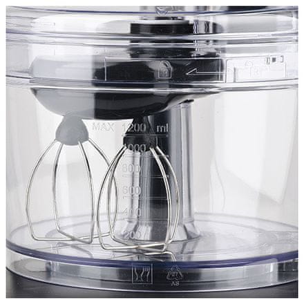 - reže, sjecka, drobi, miksa, miješa, mijesi, riba, muti- snaga: 600 W- velika posuda: 1,2 l- 2 brzine / snage- turbo funkcija- dvostruka sigurnosna posuda i poklopac- 2 dvostrana diska od nehrđajućeg čelika za rezanje- planetarni dodaci za mućenje i miješanje- dodaci: oštrica od nehrđajućeg čelika, plastična oštrica, 2 diska za rezanje, metlice za miješanje, pribor za nastavke, posuda, poklopac s prešom za hranu- protuklizne nožice s vakuumskom čašicom- dimenzije (mm): 230 × 380 × 200– napajanje: AC 220–240 V ~ 50/60 Hz