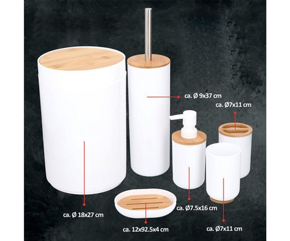 Elegantni set u kombinaciji bijele keramike i bambusa pristaje svakoj kupaonici. Uključuje wc četku, dozator sapuna, čašu za vodu, stalak za osobnu higijenu, stalak za posuđe i kantu za smeće.