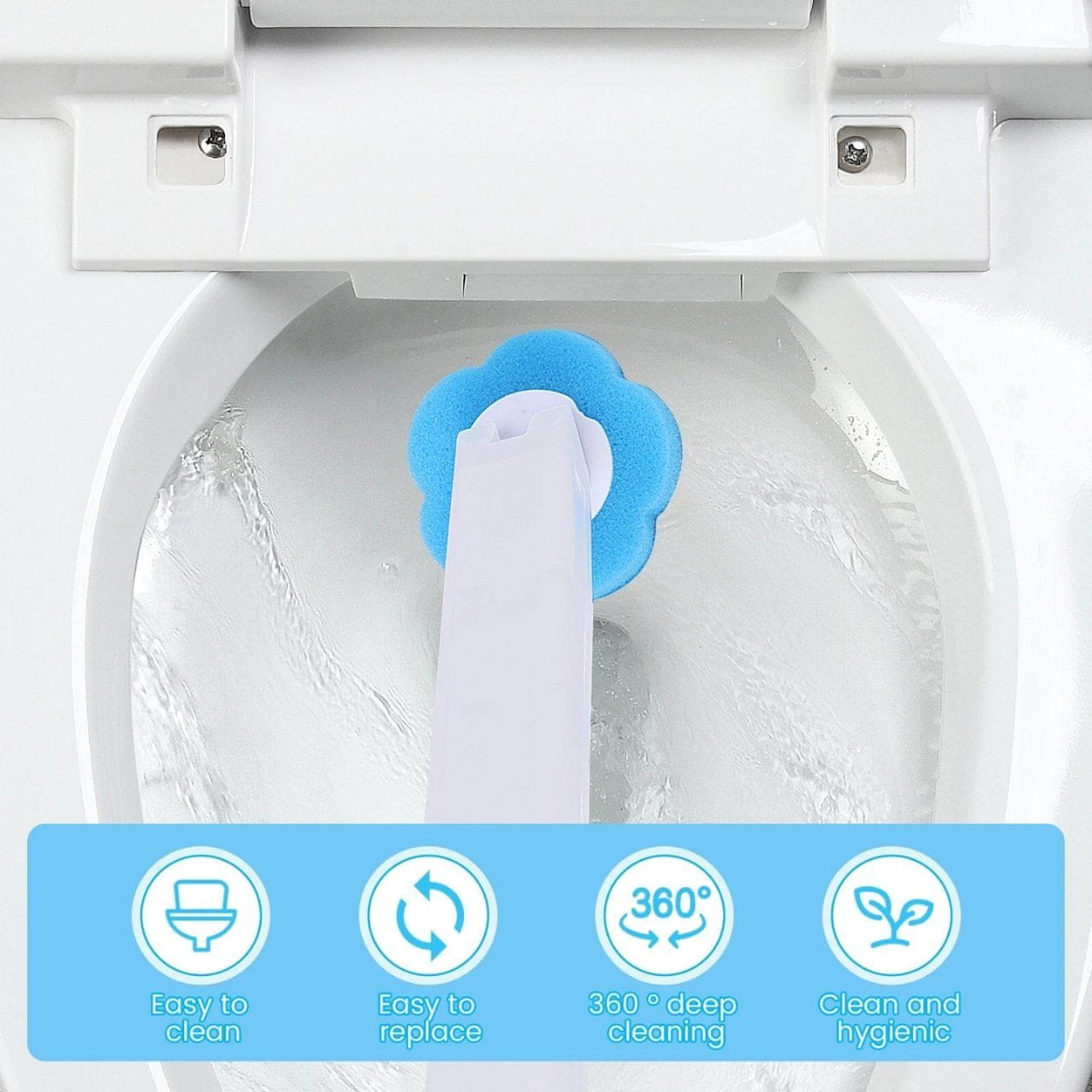• 360° dubinsko čišćenje ➝ spužva doseže skrivene kutke školjke ➝ WC ostaje blistavo čist bez napora