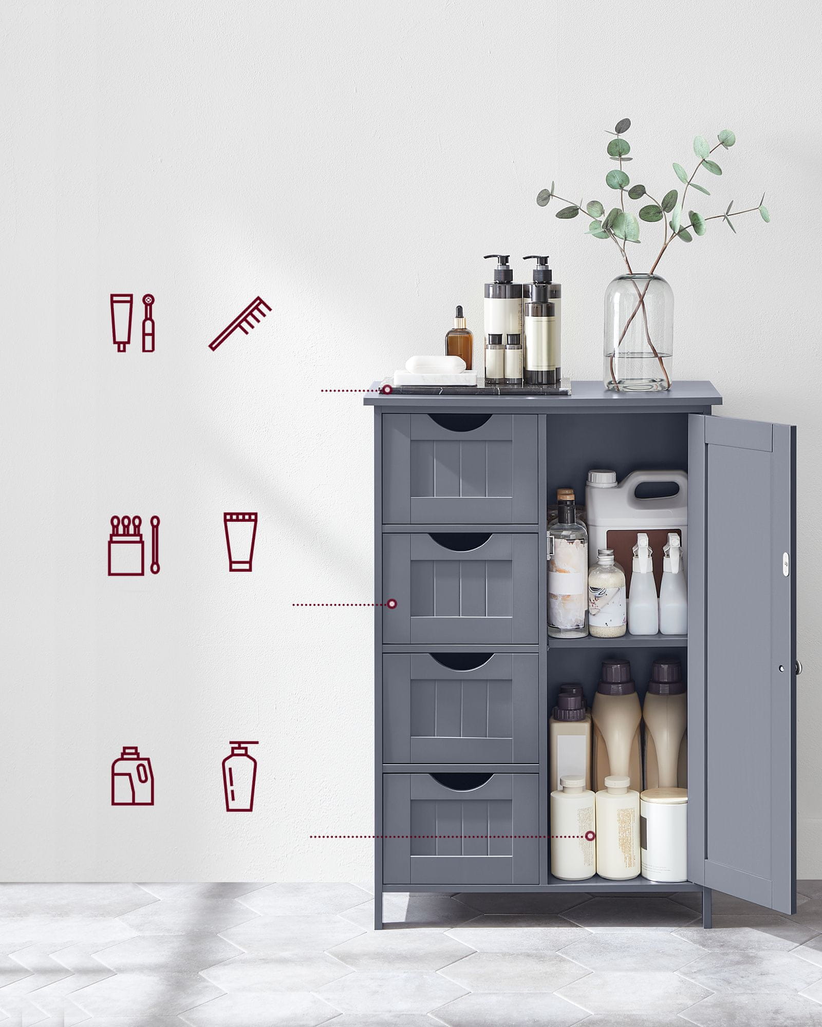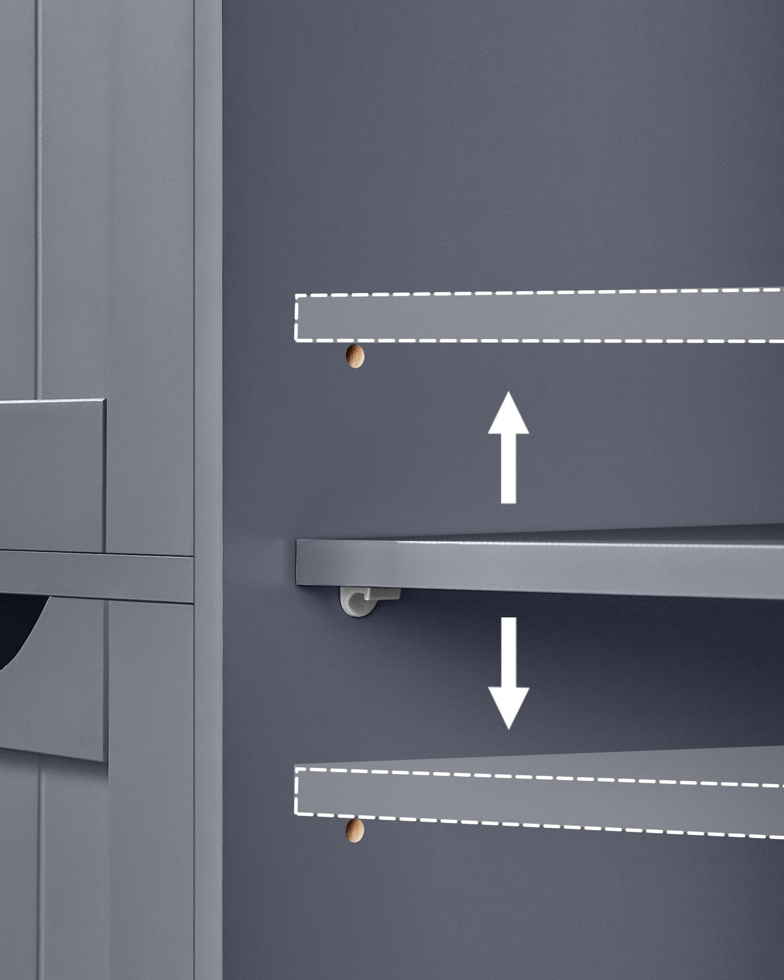 Ovaj svestrani ormarić dizajniran je za praktično rješenje skladištenja u različitim prostorijama vašeg doma poput kupaonice dnevnog boravka kuhinje ili hodnika. Njegova samostojeća konstrukcija i klasični dizajn čine ga prikladnim za organizaciju potrepština uz istovremeno unaprjeđenje vašeg interijera. Ormarić ima više ladica i podesivu policu iza vrata što vam omogućuje da svoje stvari držite uredno posložene.