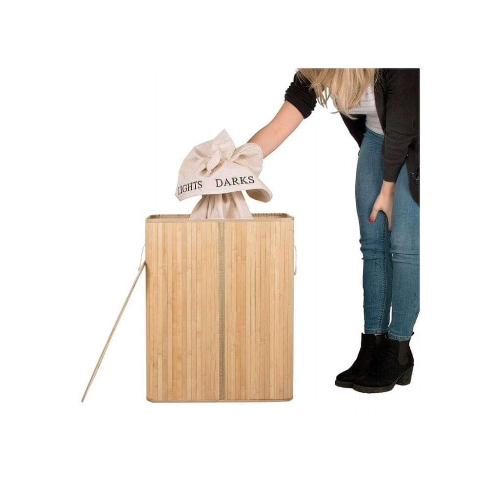 Springos košara za rublje od bambusa kapaciteta 100l s dva odjeljka praktičan je i funkcionalan dodatak svakom interijeru. Košara za skupljanje prljavog rublja i donjeg rublja izrađena je od prirodnog bambusa u svijetlosmeđoj boji. Lagana konstrukcija i moderan dizajn, uklonjiva unutarnja vrećica ne upija vlagu i mirise, veliki volumen, praktična ručka.