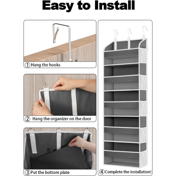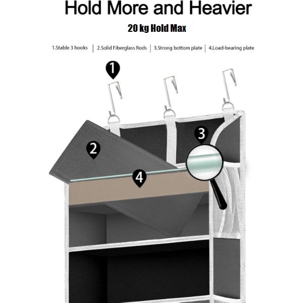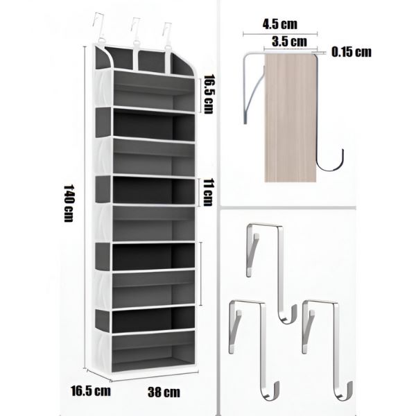 Opremljen s 3 podesiva metalna kuka, ovaj organizator lako stane na vrata debljine do 4 cm.