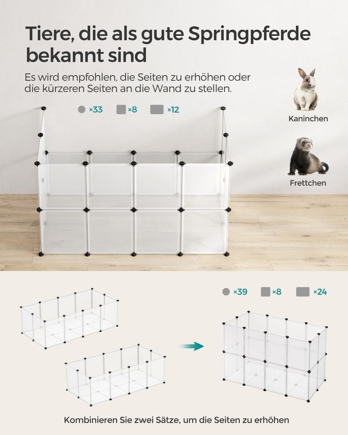 Ovaj svestrani kavez za male životinje pruža prostran i siguran prostor za kućne ljubimce poput zamoraca hrčaka ili kunića. Dizajniran za jednostavnu montažu i prilagodbu omogućuje vam stvaranje udobnog i sigurnog prostora prilagođenog potrebama vašeg ljubimca. Prozračni paneli olakšavaju nadzor nad ljubimcima a istovremeno osiguravaju da je kavez jednostavan za čišćenje i održavanje.