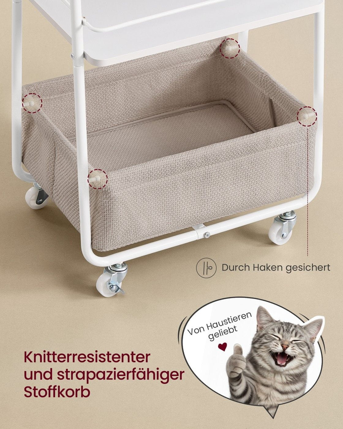 Ovaj kolica na kotačićima nudi svestrani prostor za pohranu s tri razine i tkaninskom košarom, što ga čini idealnim za organizaciju vaše kuhinje, dnevnog boravka ili spavaće sobe.
