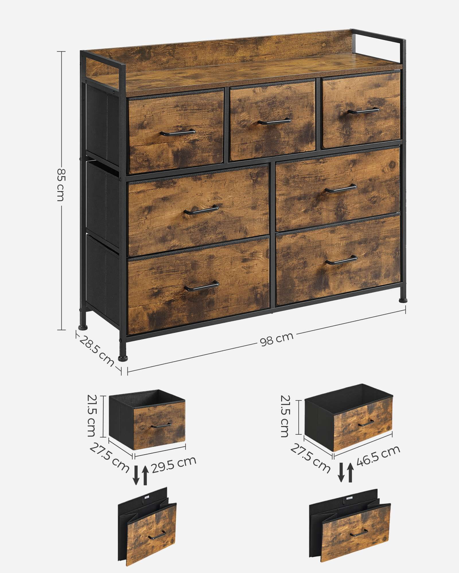 Ova komoda s ladicama od tkanine nudi moderan i praktičan način za pohranu u vašem domu. Dizajnirana s kombinacijom industrijskih i rustikalnih elemenata ima čvrst metalni okvir i više ladica koje pomažu organizirati odjeću i dodatke u spavaćoj sobi hodniku ili dnevnom boravku. Svestran dizajn i izdržljiva konstrukcija čine je prikladnom za dugotrajnu upotrebu pružajući funkcionalnost i estetsku privlačnost.