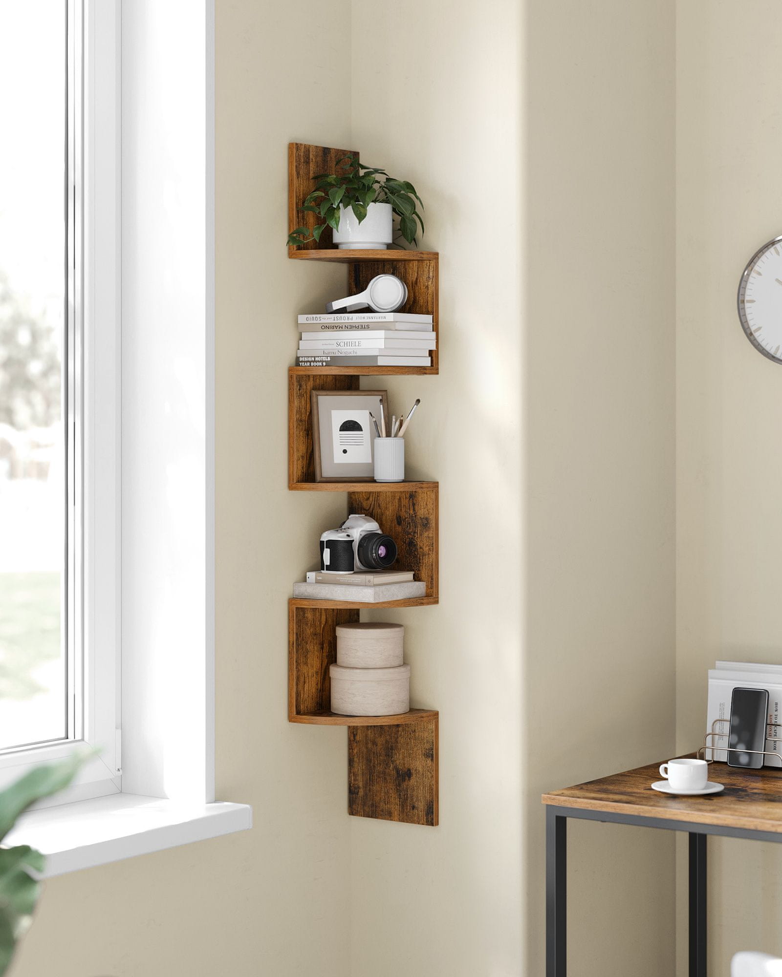 Iskoristite svoj prostor i izložite omiljene predmete s ovom modernom kutnom zidnom policom, jedinstveni dizajn savršen je za organizaciju knjiga ili izlaganje dekoracija u svakoj prostoriji, idealna za dodavanje funkcionalnosti i šarma malim prostorima.