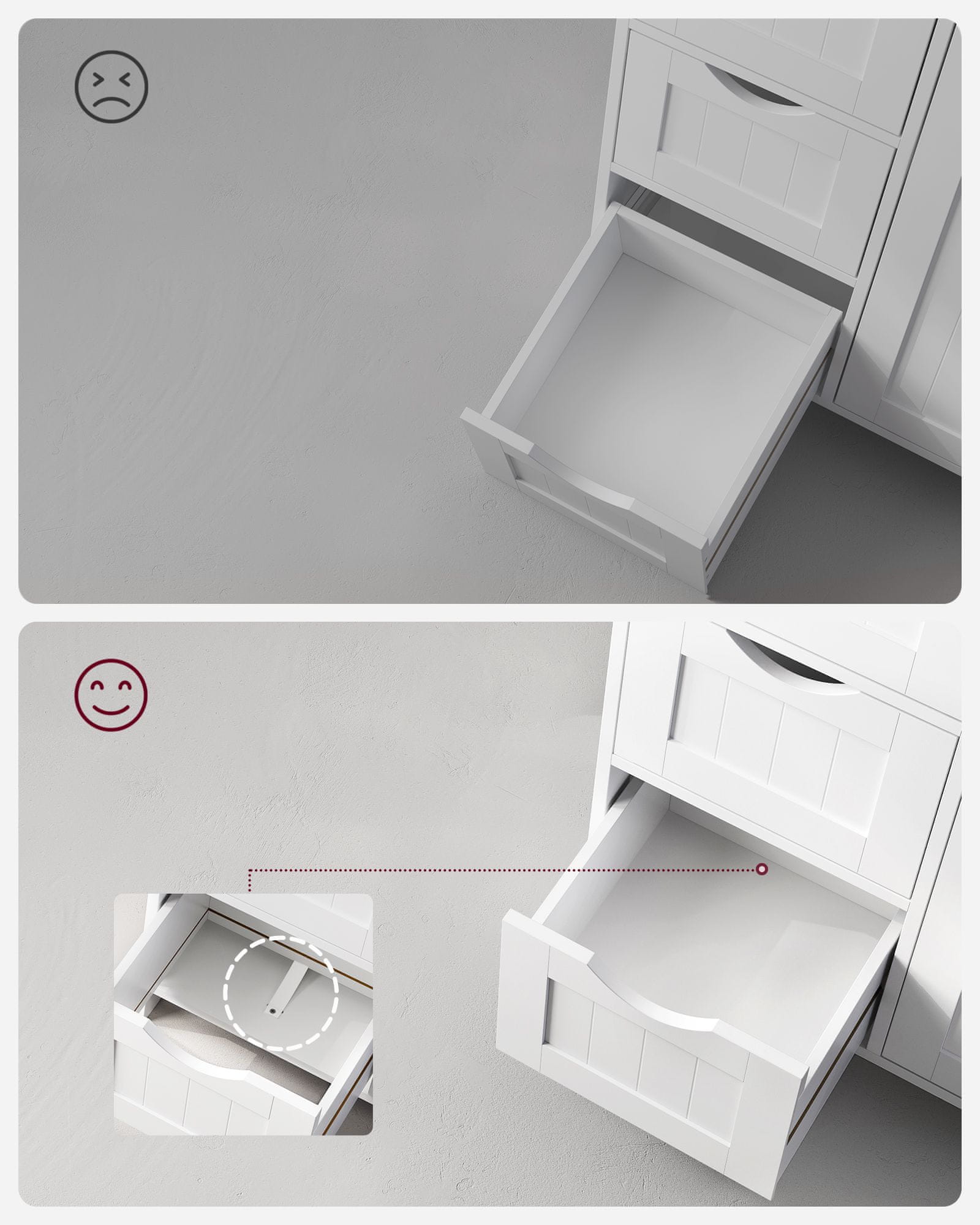 Ovaj podni ormarić za kupaonicu nudi praktično rješenje za organizaciju vaših potrepština u kupaonici dnevnoj sobi kuhinji ili hodniku. Dizajniran s čistim potpuno bijelim završetkom i jednostavnom siluetom besprijekorno se uklapa u razne stilove interijera dok pruža dovoljno prostora za pohranu s ladicama jednim vratima i podesivom policom. Njegova čvrsta konstrukcija osigurava dugotrajnu stabilnost što ga čini prikladnim za svakodnevnu upotrebu u svakom kućanstvu.