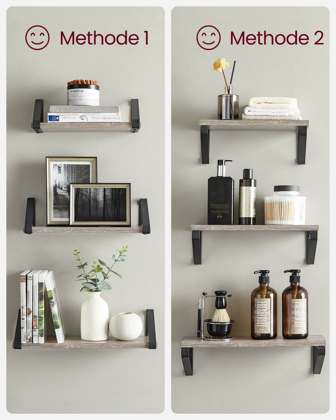 Ovaj set zidnih polica nudi moderan način za izlaganje fotografija, dekoracija ili začina uz uštedu prostora na podu. Idealno za dnevni boravak, kupaonicu ili kuhinju, ove police dodaju praktičan prostor za pohranu i moderan dodir vašem domu. Uključena jednostavna montaža na zid.