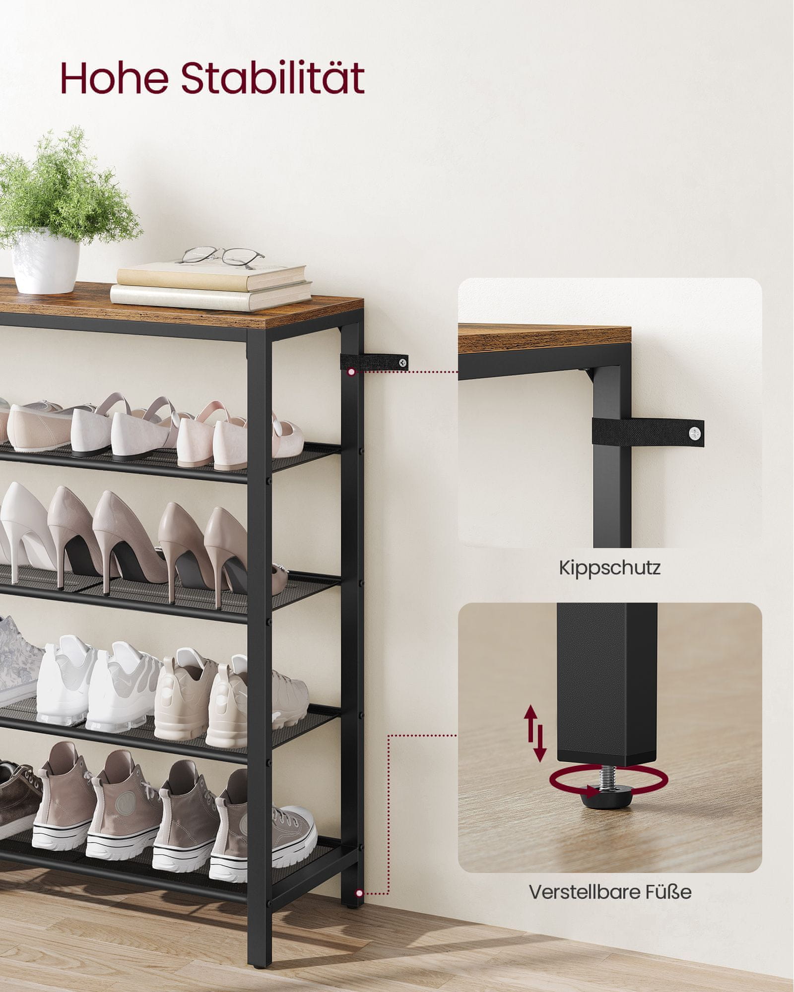 Ovaj stalak za cipele nudi praktično i stilsko rješenje za organizaciju cipela i torbi u vašem predsoblju ili hodniku. Sa svojim industrijskim dizajnom i vintage izgledom skladno se uklapa u različite stilove interijera pružajući pritom dovoljno prostora za pohranu. Čvrsta konstrukcija osigurava pouzdanu potporu za vašu obuću i dodatke.