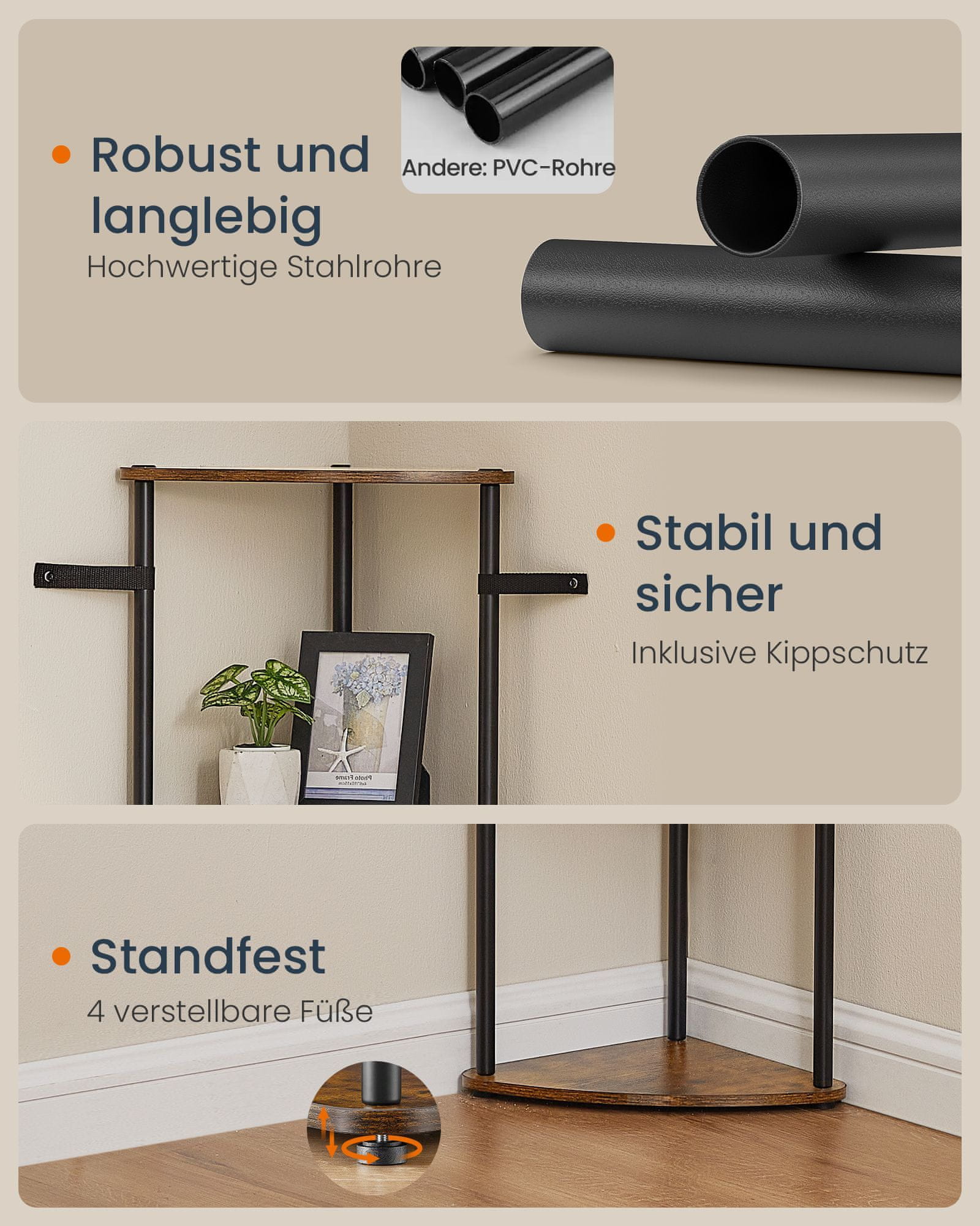 Ova kutna polica s pet razina dizajnirana je za maksimalno iskorištavanje prostora za pohranu i izlaganje u vašem dnevnom boravku spavaćoj sobi ili kuhinji. Brza montaža bez alata čini je praktičnom za postavljanje dok čvrsta konstrukcija osigurava pouzdanu potporu za vaše predmete. Vintage smeđa završna obrada dodaje dašak klasičnog stila svakom interijeru.