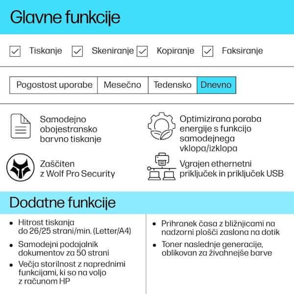 HP višenamjenski laserski pisač u boji može se pohvaliti naprednom tehnologijom laserskog ispisa u boji koja osigurava iznimnu kvalitetu ispisa. Bilo da ispisujete dokumente, izvješća ili prezentacije u boji, vaš će ispis uvijek biti oštar, živopisan i profesionalnog izgleda. Ispis visoke rezolucije osigurava precizne detalje i živopisne boje koje će impresionirati vaše kolege i kupce.