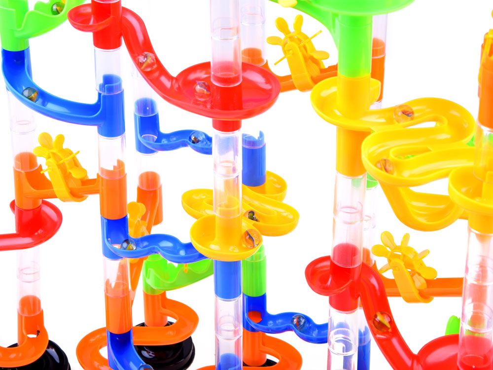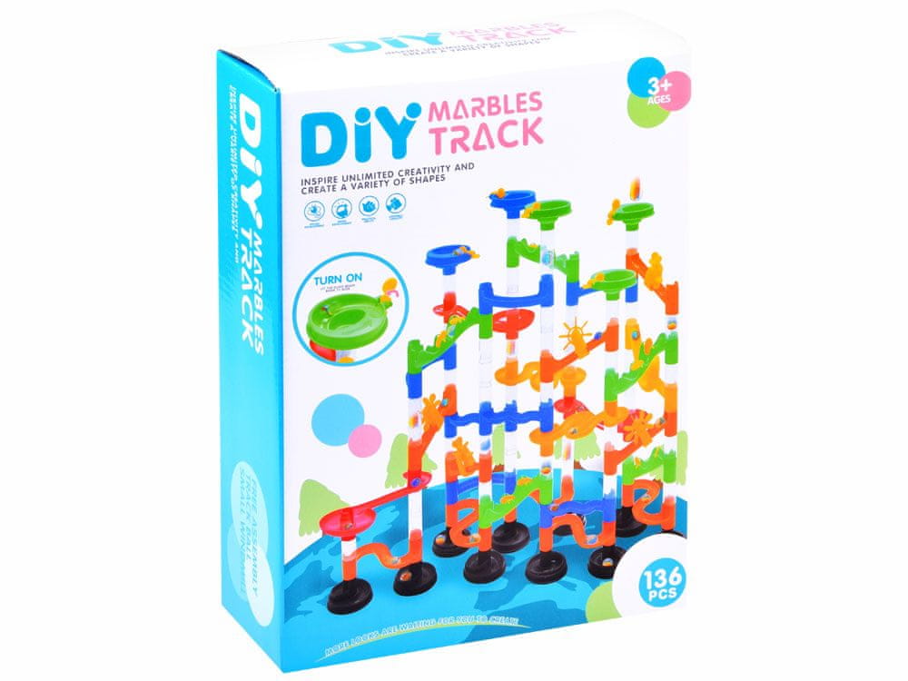 Marble je zavojita staza za kuglice koja se sastoji od čak 136 elemenata! set zahtijeva vlastitu izradu kako biste mogli nastaviti uzbudljivu igru s kuglicama. Uzbuđenje zajamčeno!Set je u cijelosti izrađen od obojenog plastike, dijelovi se lako spajaju i stvaraju strukture za uvijene spirale, tako da se kuglice mogu slobodno kotrljati, kotrljati, juriti!Marble je staza za kuglice sastavljena od savitljivih dijelova i 31 šarene kuglice, s kojima dijete može stvarati jedinstvene i neponovljive staze. Djeca mogu reproducirati modele nacrtane na kutiji ili eksperimentirati i graditi vlastite konstrukcije: tobogane, mostove, stupove, okretišta, dvostruke spirale i dimnjake mogu se različito kombinirati.Igračka potiče kreativnost, prostorno razmišljanje i razvija manualne vještine.Tijekom igre dijete također razvija logičko razmišljanje, planiranje, razvija psihomotoričku koordinaciju i motoriku.
