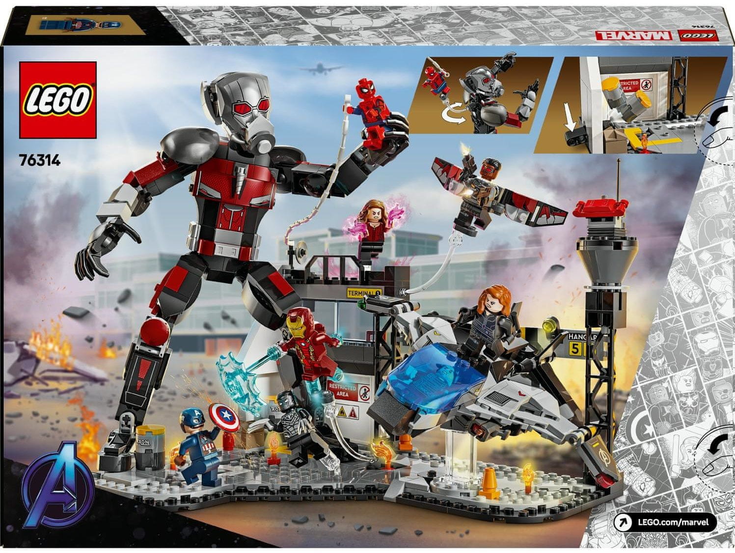 Bitka iz filma Kapetan Amerika: Građanski rat (76314) je složeni set za gradnju iz LEGO® Marvel asortimana koji je epski superjunački dar za djecu od 10 i više godina. Ovaj LEGO set za igru sadrži 9 LEGO Marvel figurica, avion Quinjet i puno dodataka za djecu da ponovno prožive svoje omiljene trenutke iz filma, istražuju beskrajne maštovite avanture i osmišljavaju vlastite prikaze. Quinjet ima sklopiva krila i kokpit koji se otvara u koji se može smjestiti pilotska minifigura. Element bačve koja eksplodira uklopljen u krajolik uzletišta modela dodaje dašak borbe.