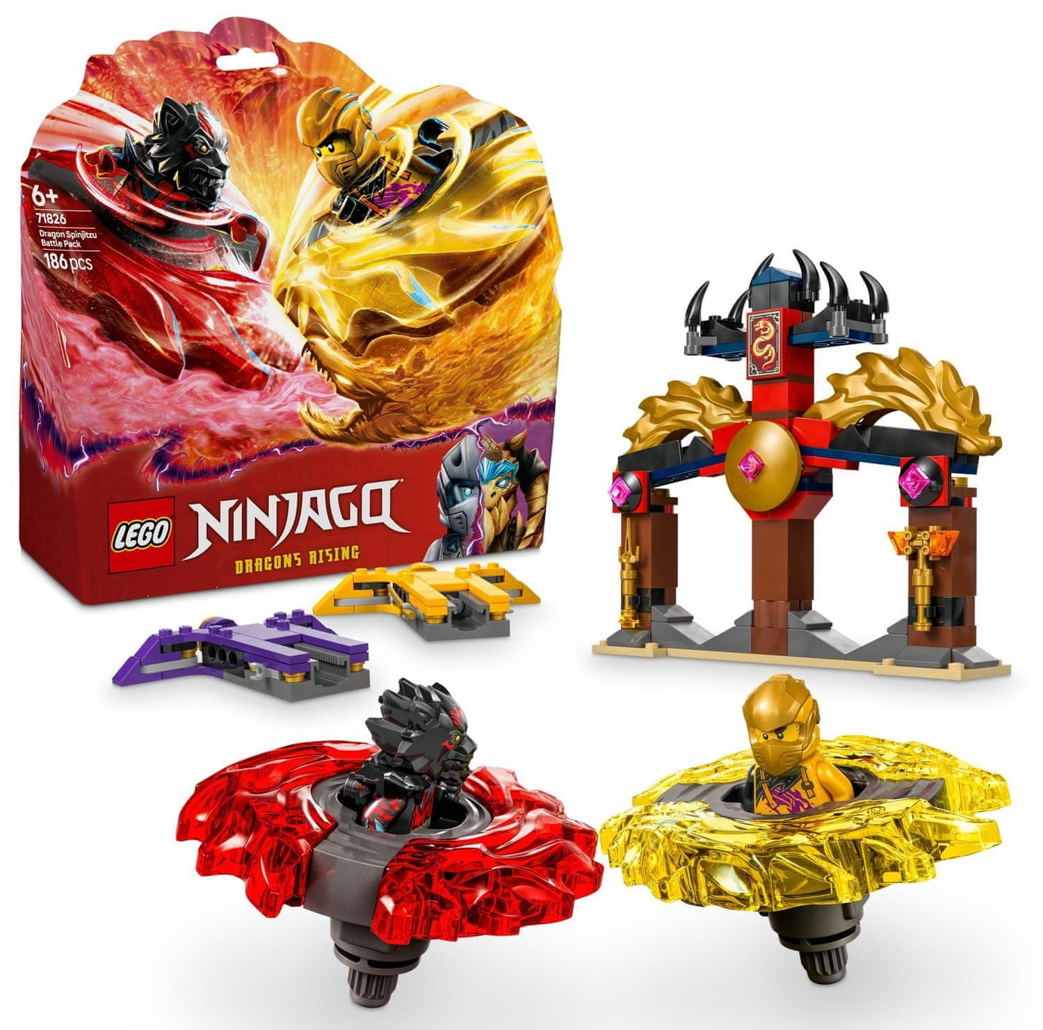 Uz akcijski set Dragon Spinjitzu Battle Pack (71826), dječaci i djevojčice od 6 i više godina mogu se prisjetiti nevjerojatnih akcijskih scena iz 3. sezone TV serije NINJAGO® Rise of the Dragon. Ovaj mini LEGO® akcijski set uključuje model hrama s borbenom arenom, 2 minifigure Arina i Rasea i 2 zmajeva Spinjitzu spinnera za djecu koja mogu staviti u bacače kako bi pucali jedni na druge tijekom bitaka.